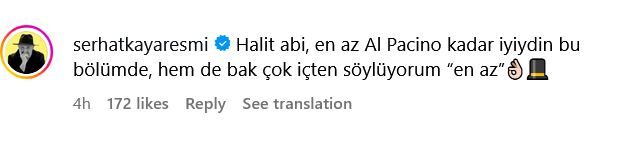 Под клипчето писателят Серхат Кая - "Халит аби, в този епизод беше поне толкова добър, колкото Ал Пачино, и виж, наистина го казвам "поне“ 👌🏻🎩"