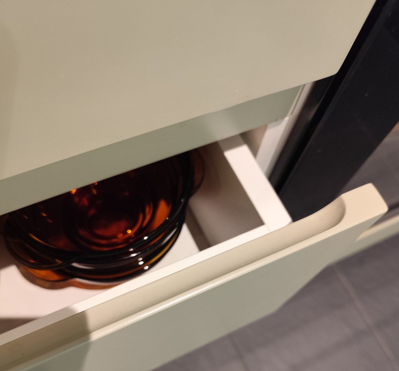Единственият пуш в тази кухня без дръжките, е на горния шкаф над абсорбатора, щото няма как вратата да се отваря като другите. Има още 5 горни врати, три долни и седем чекмеджета. Неслучайно снимах чекмеджето. И долните врати са с такава фаска. Много е удобно като захват. И е абсолютно все тая дали ще са с дръжки или без въпросните чела, от гледна точка на панти, износване или каквото там се сети човек.