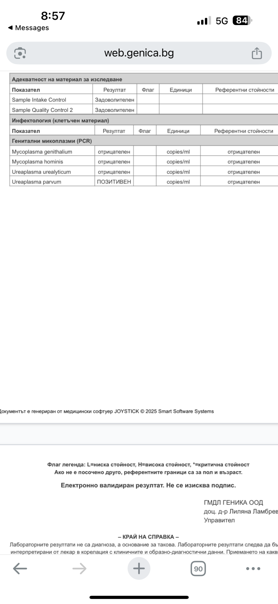 А да ви питам - вие само в Геника ли вярвате на резултати от цервикален секрет? Аз имам пускани преди това в други лаборатории (например тази на болница Надежда) за уреаплазма/микоплазма, писиари, отделно и цервикален е пускан пак в Надежда, както и в Геника от влагалищен секрет миналата година и все бяха отрицателни. И изведнъж бам - излезе на Геника на фемифлора. Не мога да си обясня какво точно се случва. И как се оказах с тази уреаплазма изведнъж сега. Възможно ли е някак си да не са я хващали? Важно е да се отбележи, че години наред все се мъкнех с бактериална вагиноза и най-вече Гарднерела. Лечения там проведох множество. Сега уж я няма, не се знае до кога. Не знам вече ми минават някакви мисли, че примерно уреаплазмата някак си да не е излизала, заради Гарднерелата, ако това изобщо е възможно. Просто ми е необяснимо от къде се взе тази уреаплазма. Мъжа ми си е правил писиара на Надежда, който се води за полово предавани болести и там му е отрицателно на него като резултат.