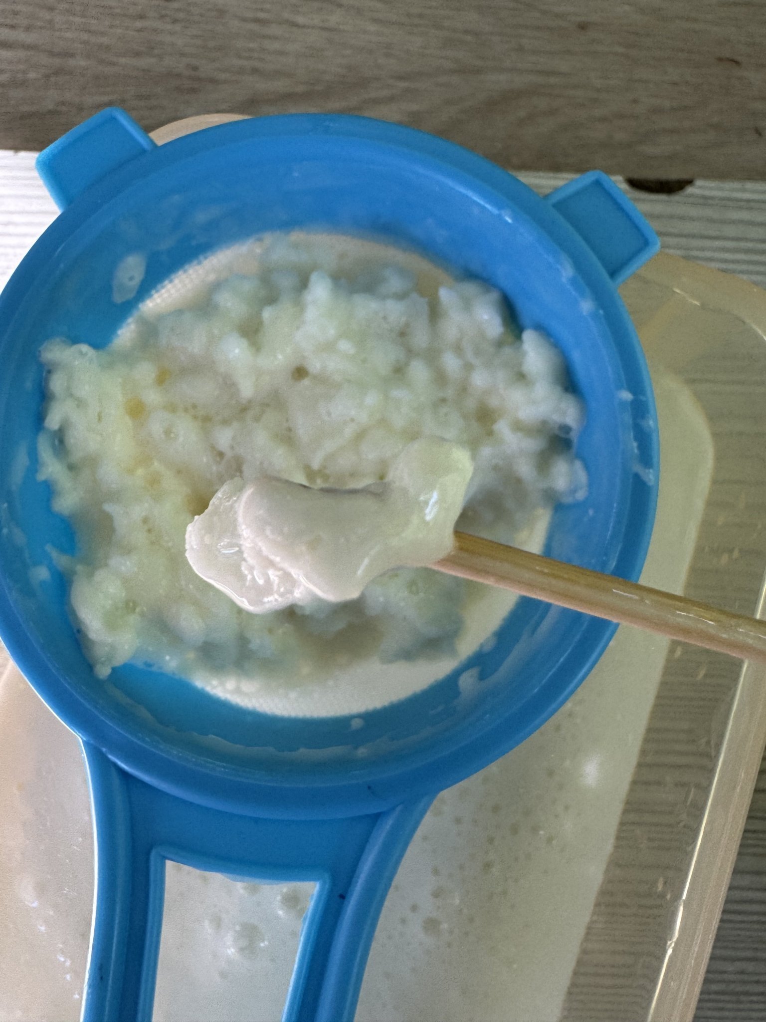 Разбърквам буркана, оцеждам малко и бъркам, то бавно се прецежда. Като остават зърната.