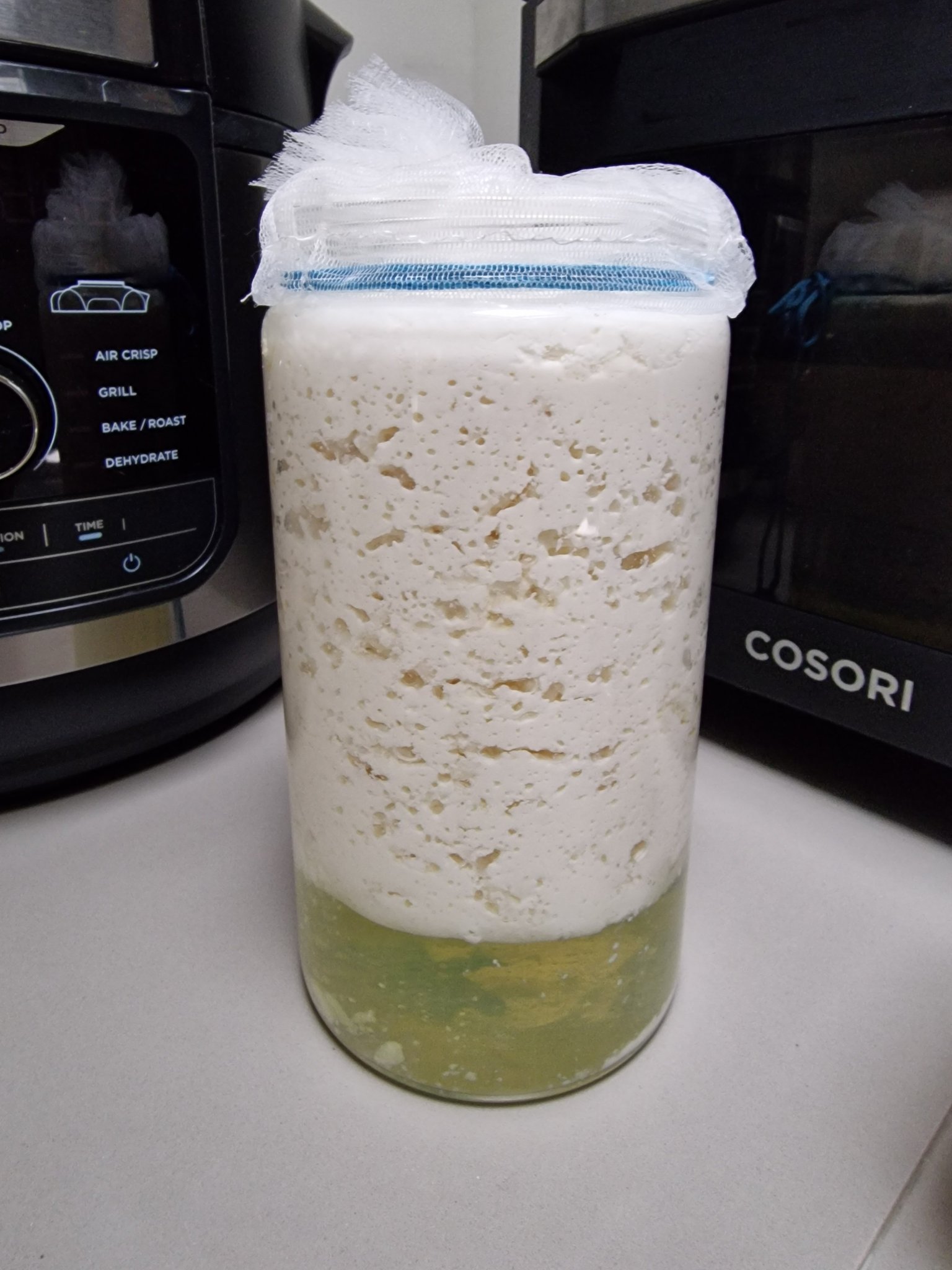 Да питам по-опитните. Нормално ли е да изглежда така кефира ми? Вече става готов грубо за 24 часа. Има ли начин да взема само гъстата част. Когато се смеси с цвика, става орекалено течно за мен, ако гонискам като кисело мляко. Иначе, пробвах и варианта с плодове и чия. Не е лош.
