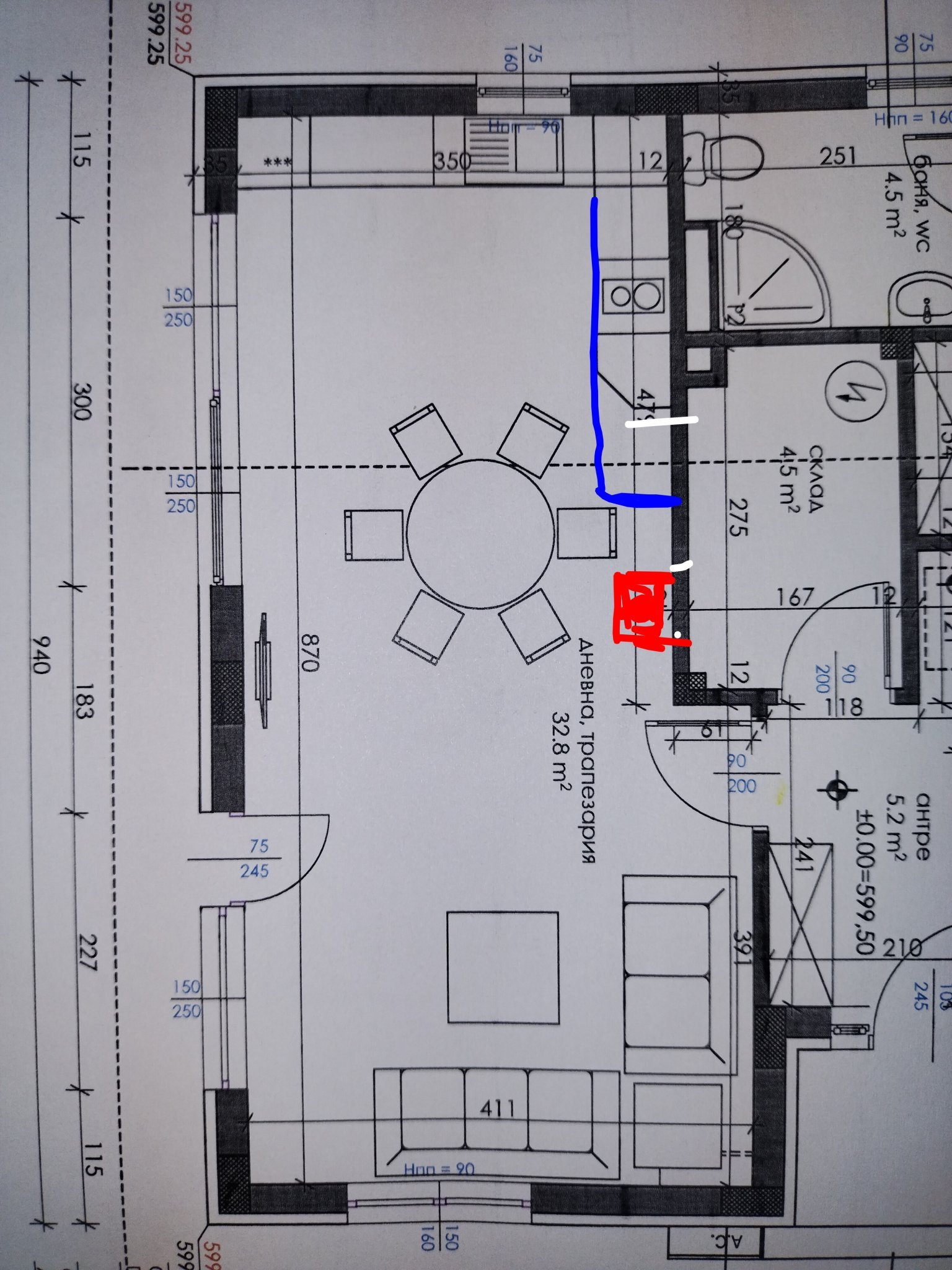 ДЗХ, стената отдясно до чупката е 4.80 м. Камината ще се сложи примерно на около 30-40-50 см от ъгъла (отбелязаното в червено). А дясната част на кухнята може да се удължи до около 2.80, и пак ще останат около 100 см до печката, за да не се нагрява. Тази камина е за резерва, като алтернативно отопление или просто за уют и жив огън. Имаме изградена инсталация за термопомпа вода-въздух с подово и конвектори.