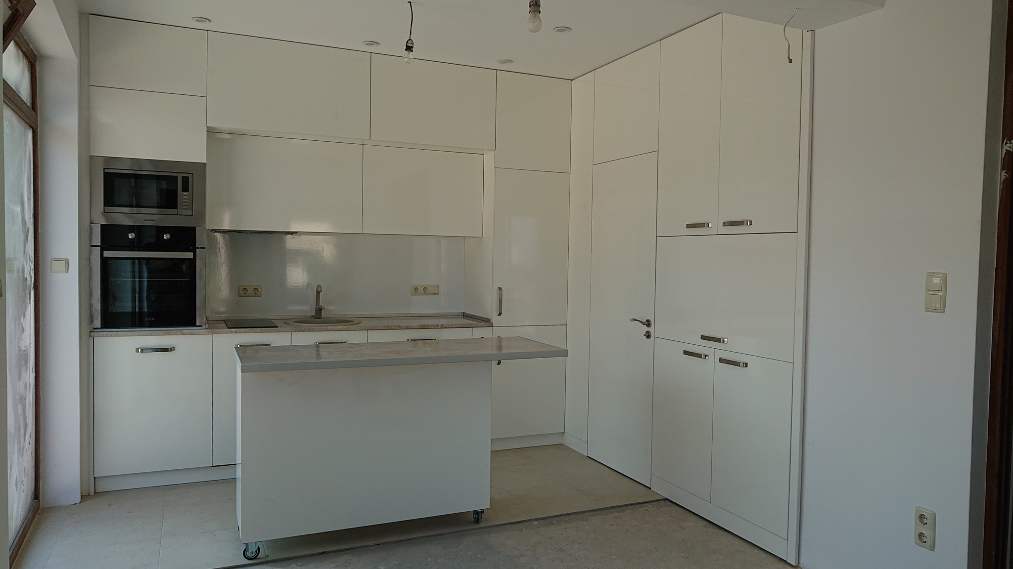 Размерите са 235 на 178 см. Като махна чупките от комина и вертикалния щранг, остава точно 4 квадратни метра. Шкафовете от двете страни на фурната са широки, та преспокойно на мястото на единия би могла да бъде поместена пералня (моята е в коридора).
