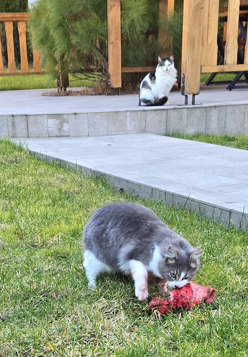 Този най-малкият скоро ми изкара акъла, посрещна ме целия в кръв и си викам: "айдеее, пак клетки, доктори" и след малко довлачи плячката. Огромен бял дроб от който беше изял половината. Майка му и чичо му го гледаха безучастни отстрани. Така и не разбрах, откраднал ли го е отнякъде, почерпили ли са го, но беше съвсем пресен и алено червен. Първо мислех да му го взема да не му стане нещо, но той постоянно влачи пилета и мишки, така че явно е кален.