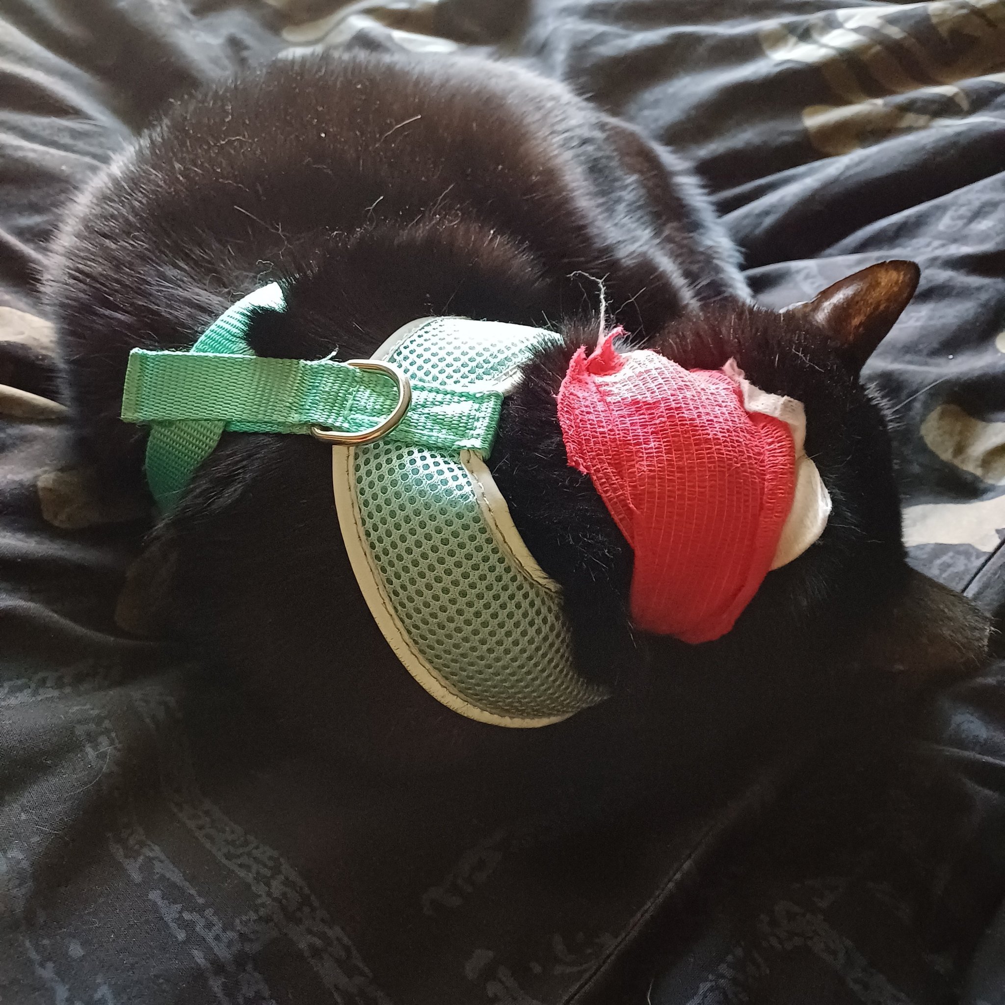 След малко ще правим превръзка- със самозалепващ бинт (това розовото). Но и това не е достатъчно да го спре да драпа с огромноте си ноктаци, затова слагам "усмирителна риза" (нагръдника)- когато ме няма. Никак не е доволен, но само така го озаптявам да не се дере.