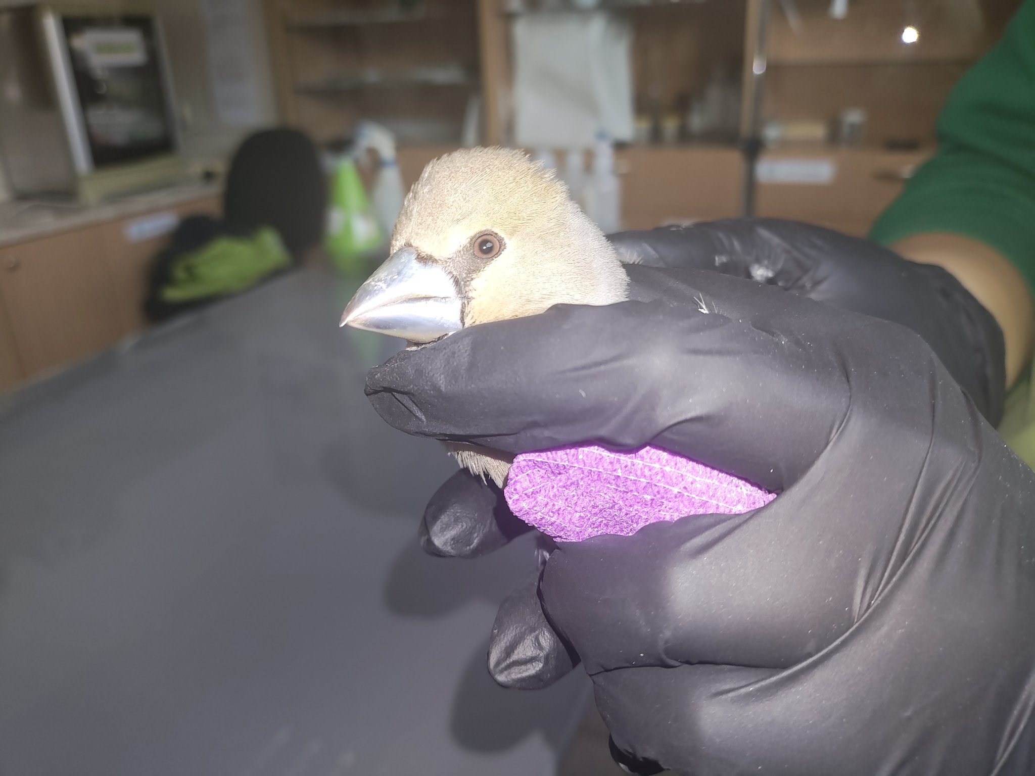 Вчера на птичето му направиха шина на крилото, биха му витамини и сложиха пудра срещу паразити. Претеглиха го - 40 гр душица.