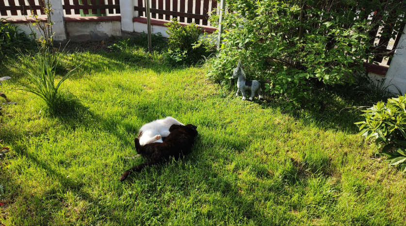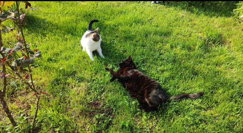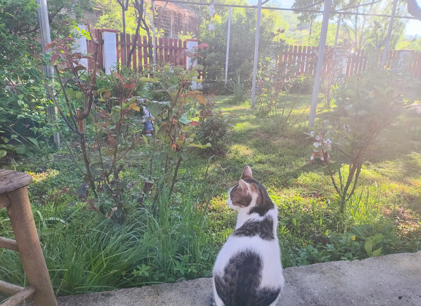 Имам чувството, че Лео няма да стане много голям. Това тук е много странно, но местните котки са дребни, дори когато са големи на възраст. Масово са черно и бяло като моята Точка и такъв размер - дребосъци. И като гледам и Лео няма да е от едрите, за сметка на това вече има меко и мазно коремче, идеален за мачкане, сина ми го меси като тесто и той стои. Много добро коте е, гальовно, мъркащо, като му говориш те гледа в очите и ти отговоря с - ме е е е ☺️ Приказливко е, но едно нежно гласче вади. Като не броим минираните рози през зимата, сега поначупи едни карамфили и есента е влязъл в парника, прекопал репичките ( които не поникнаха), но пък разсадил зелената салата и сега в половината двор има салата ( явно семената са полепнали по лапите), не прави бели. Кротна се като цяло и е миличък и си стои или на двора или до нас, не обикаля на далеч.