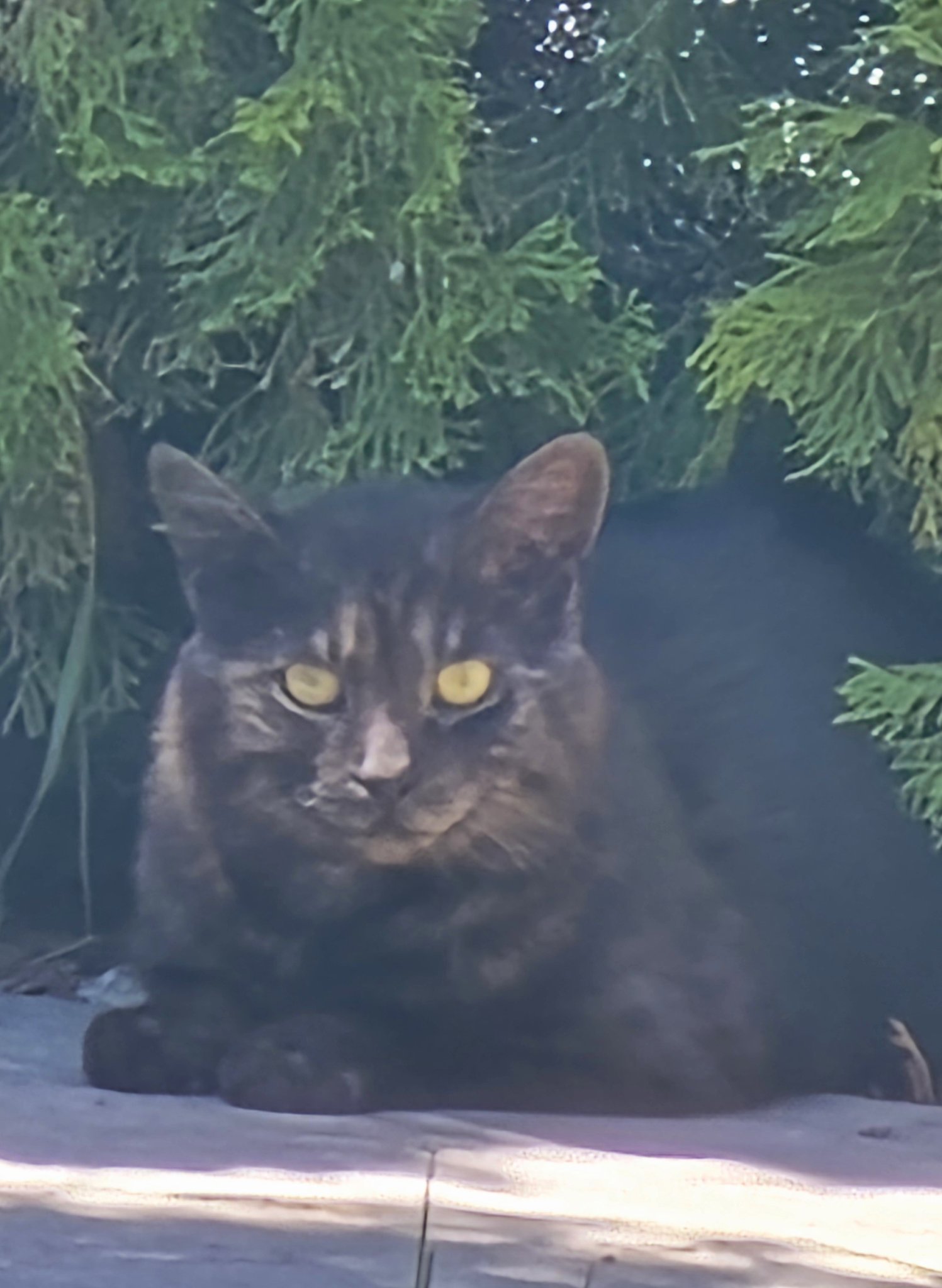 И понеже все пак темата е котешка, да ви покажа новия кандидат-комшия, който се навърта от няколко дни. Страхотен красавец, уж е черен, а има петна като на леопард. Много искам да го прибавя към групата, ама Мимчето и Мишо обикалят като барети из двора и го гонят. Мима откакто е кастрирана стана друг човек😆