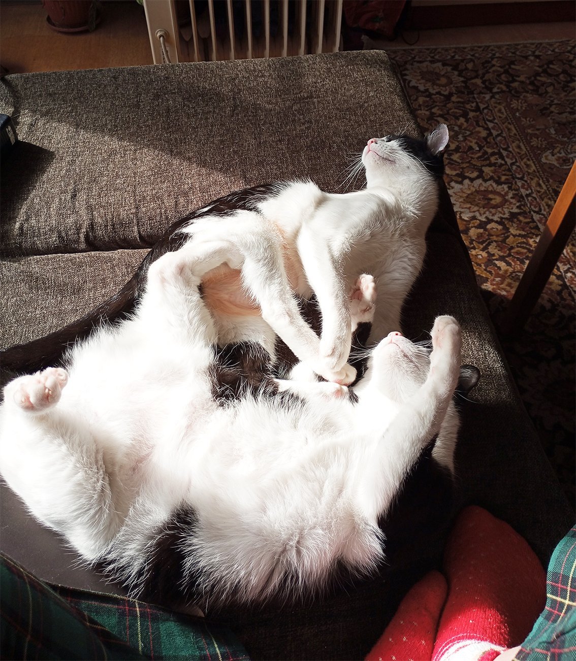 Гадината идва всяка сутрин щом чуе алармата ми и настоява да стана (добре, че е така, та в сряда ме спаси от успиване. Уж за минутка, пък то съм продължила да спя и добре, че тя ме е почакала десет минути и пак дойде да ме събуди). Събота и неделя също идва малко след шест сутринта и настоява да стана и да й сложа в купичката, нищо, че й е пълна в повечето случаи. Вчера ме събуди пак, поглеждам - 7.18 ч. Викам си, нещо се е успала и зацепвам, че по старото време е 6.18, та точна си е гадта. Обаче сутринта ставам и влизам в хола, а тя спала на дивана. Седнала, понеже е чула алармата, ама физиономията й една сънена и ме гледа недоумяващо. По нейния часовник е 5.20 ч.