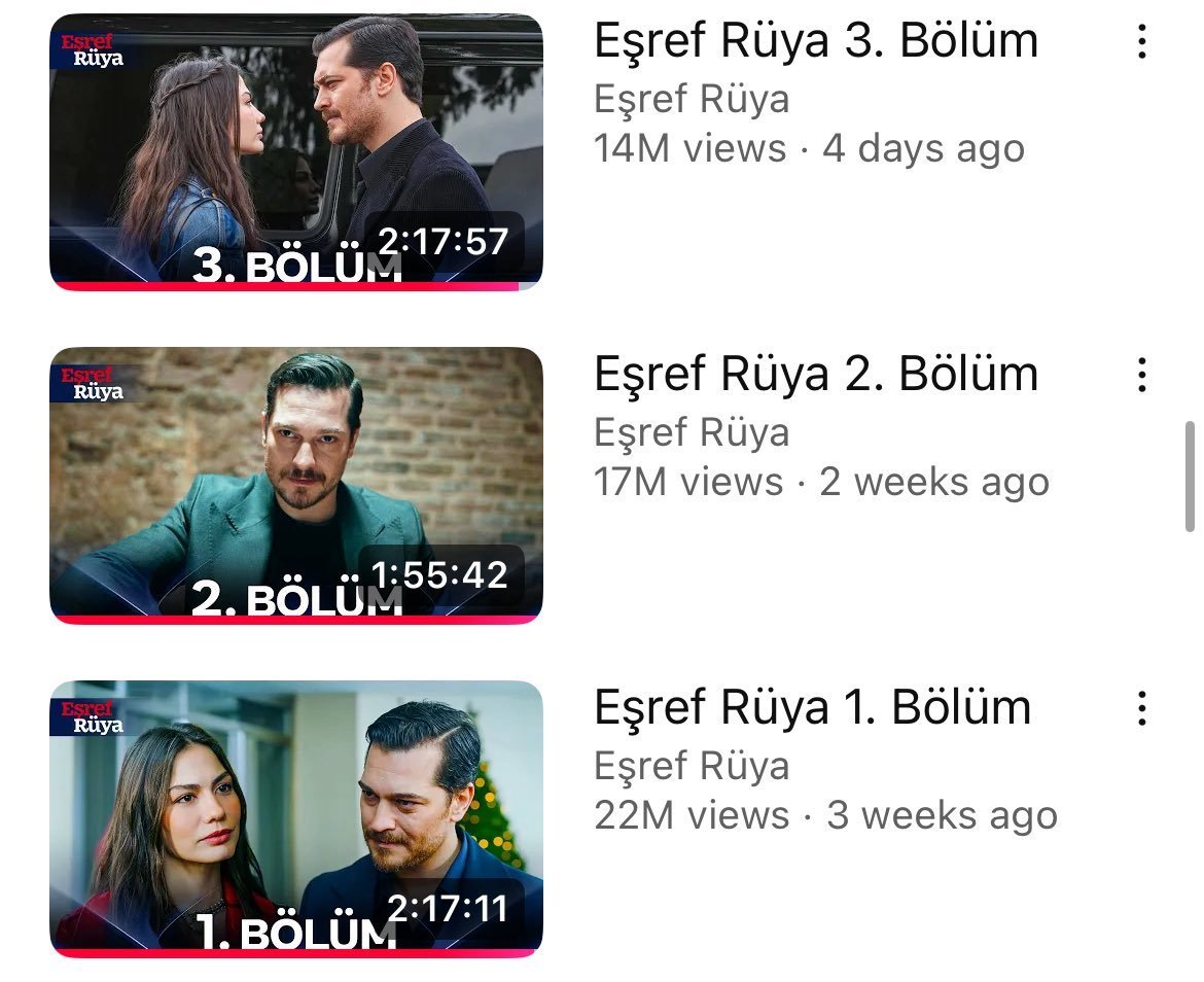 Сериалът Eşref Rüya, с участието на Demet Özdemir и Çağatay Ulusoy, започна да отговаря на очаквания рейтинг и нива на гледаемост. Шамарът в лицето на твърденията, че не може да постигне очаквания успех с първите си 3 епизода, дойде от гледаемостта в YouTube. Първият епизод на Eşref Rüya, който беше публикуван на официалната страница в Youtube, достигна точно 22 милиона гледания.