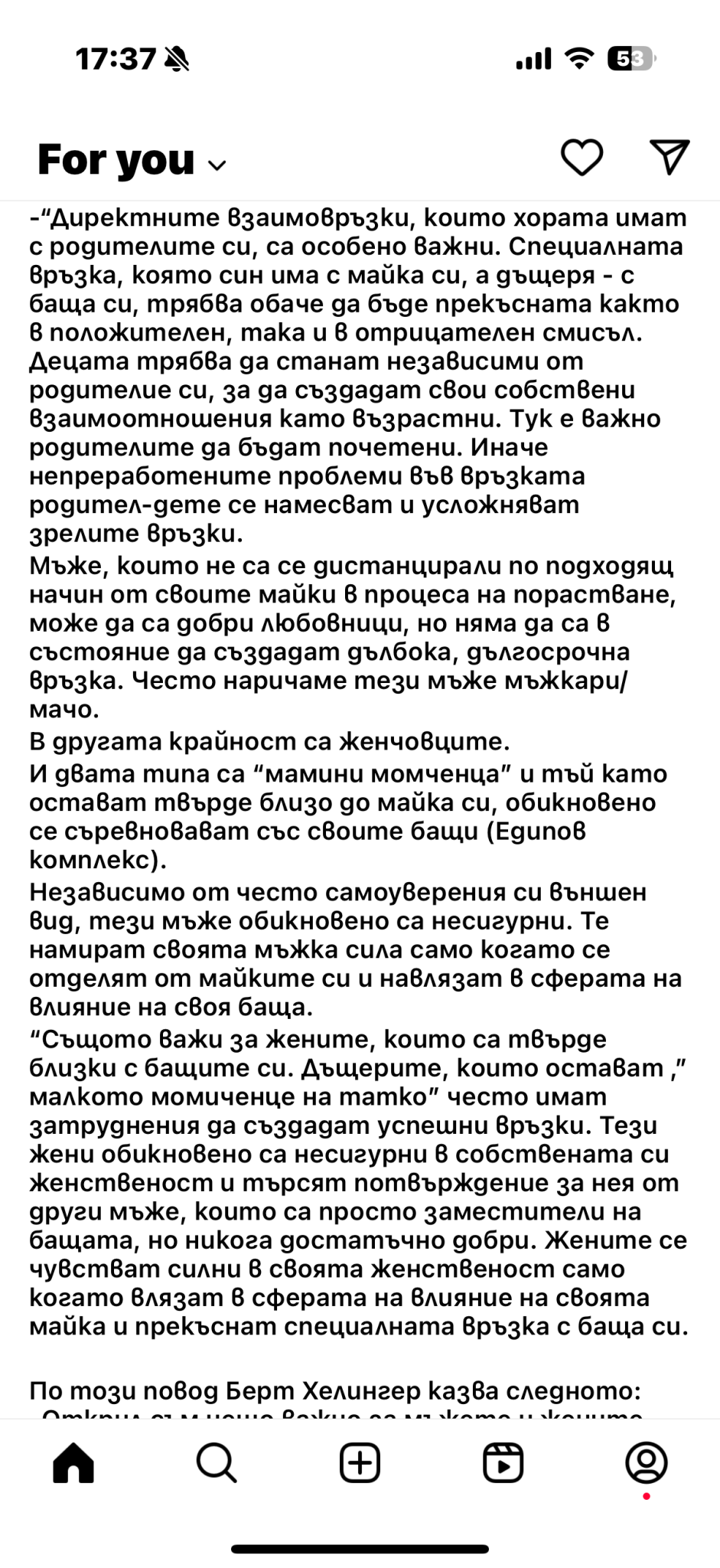 Бившата жена на Мартин споделя част от четиво, което препоръчва за взаимоотношенията между деца и родители и какво се случва, ако някоя от тези връзки е прекъсната или обратното е твърде задълбочена и последствията в бъдеще. Все едно ни пуска жокер и за двамата ергени, че дори и част от участничките, с този откъс можем да намерим доста отговори на въпросите, които си задаваме тук редовно.
