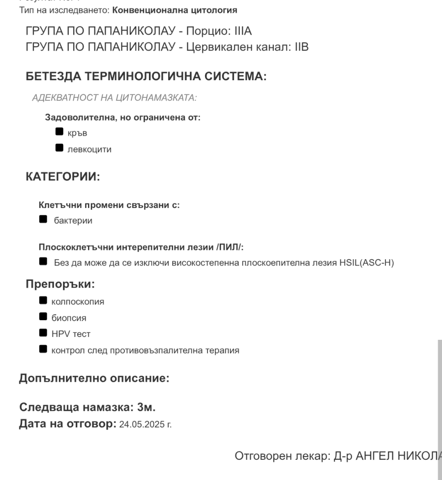 Аз бях с ЦИН 1 на 30 и процесът се обърна, на 31 всичко беше наред. Даже звънях на патолога да го питам сигурно ли е това, което е писал, че човекът даже втори път ми гледа стъклата.