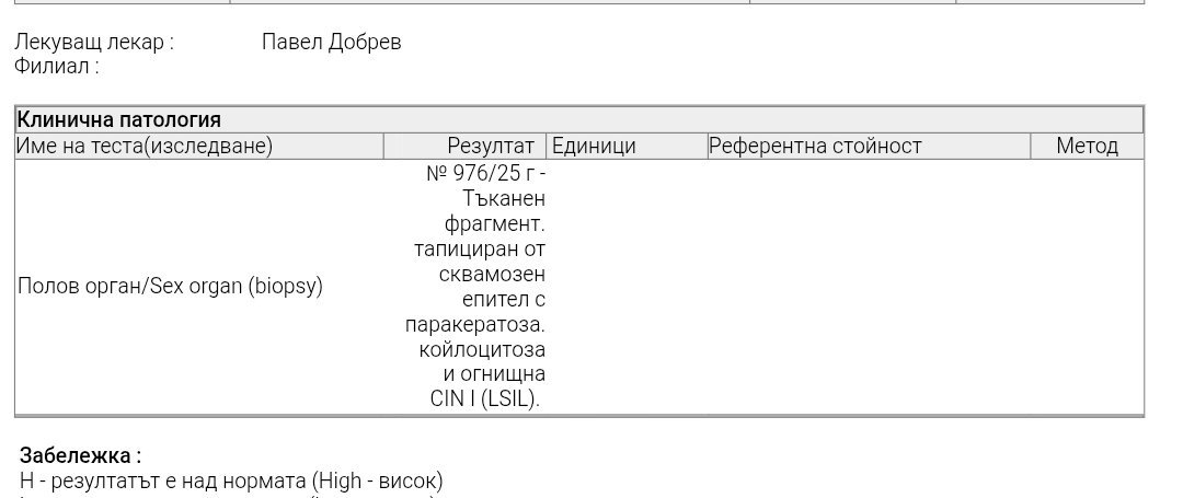 Здравейте, в събота следобед излезе моята биопсия. От Бургас съм-колпоскопията и биопсията ми ги прави доц. Добрев, но по принцип от 15г.си ходя при друга гинеколожка, която ми препоръча конизация, останалите методи не са достатъчно надеждни според нея, въпреки че са много разпространени..Та така до края на седмицата ще се мъча да се срещна с него и да видим той какъв протокол на лечение ще препоръча...
