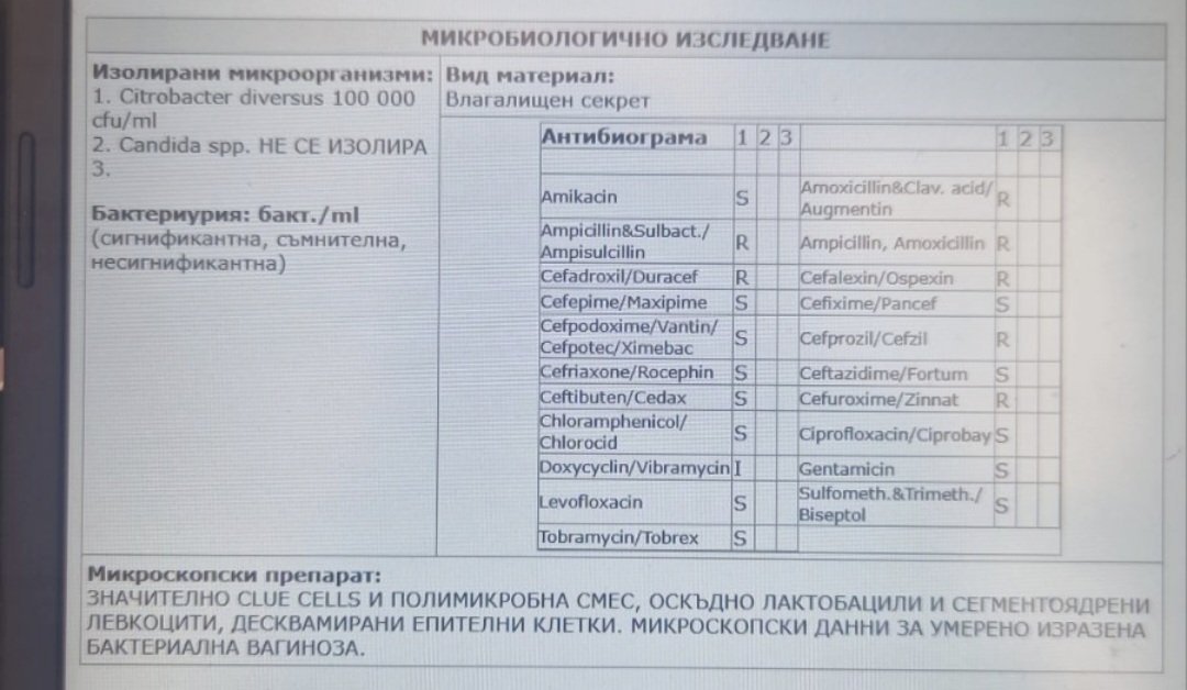 Галина, цитробактер е бактерия обикновено откриваща се в уринарния тракт. Изолира се най-често в урина. Да не Ви е замърсена пробата за влагалищен секрет? Иначе да, пуснете си обикновена и стерилна урина. Ако се открие нещо там - лекувайте и после нови изследвания - и на урината, и влагалищен секрет. Започнете и нещо за добра флора, както и уринал или нещо с червена боровинка и от този род.