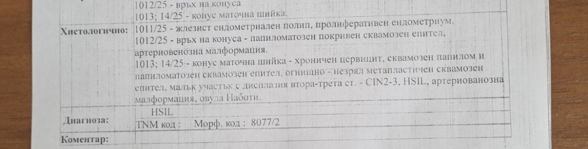 Илиянап, конусът е с папиломатоза, но няма ЦИН. Може би това е имал предвид лекарят, какво Ви обясни? Имате ли му доверие (надявам се, след като Ви е правил процедура…)? Вземете блоковете и занесете в Онкологията, ако решите за второ мнение, но Майнхард е патолог с репутация. По-скоро някой адекватно, спокойно и подробно да Ви обясни всичко, за да сте наясно и да не се притеснявате.