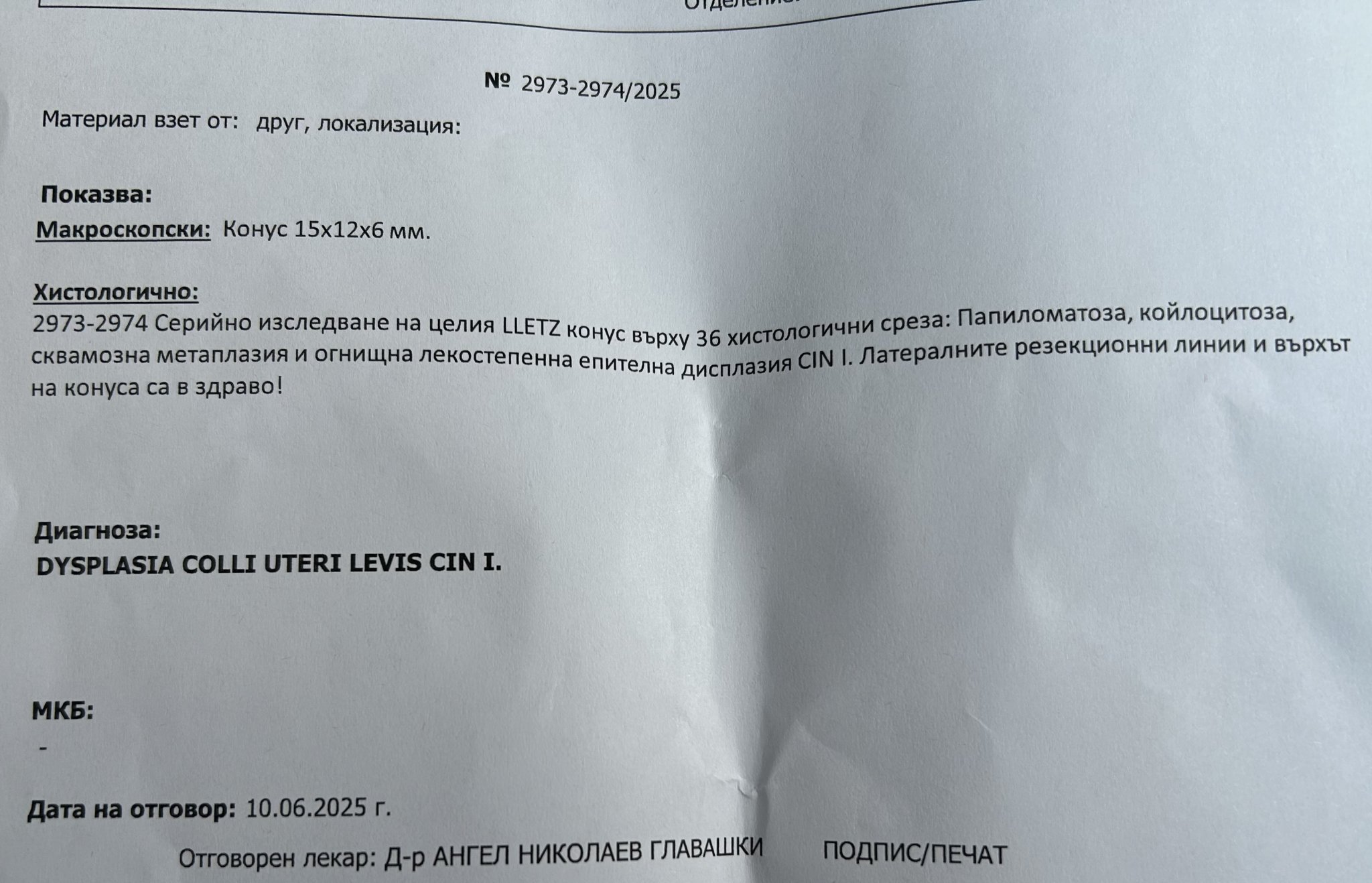 Малко предистория: раждала съм 2 пъти, нормално. Никога не съм имала каквито к да е било проблеми и оплаквания, гъбички итн. С 1 партньор съм била. Нямам и в момента оплаквания като сърбеж, папиломи, течение, дискомфорт итн