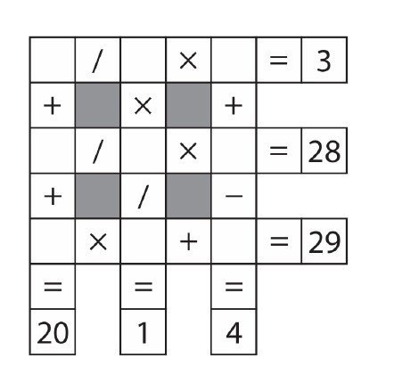 Поставете точно по една цифра от 1 до 9 включително във всяко празно бяло квадратче, така че всяка цифра да бъде използвана точно веднъж и да могат да бъдат прочетени 6 правилни изчисления (3 вертикални и 3 хоризонтални). Обърнете внимание, че изчисленията се извършват отляво надясно и отгоре надолу, т.е. първо се извършва първото действие в съответната линия и после второто, независимо от операциите. Пример: при изчислението 3 + 5 / 4 = 8 / 4 = 2.