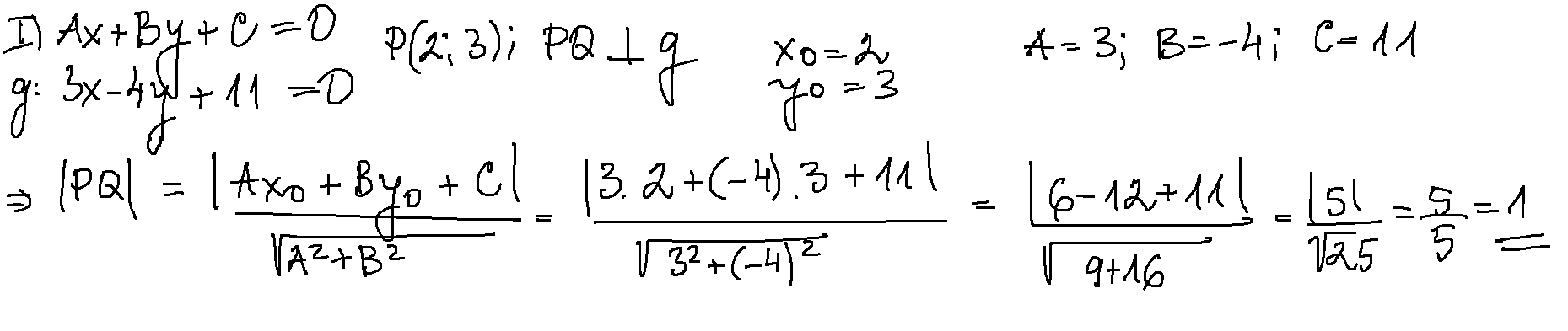 Намираме пресечната точка на двете прави и разстоянието от т. (2;3) до нея е търсеното разстояние.
