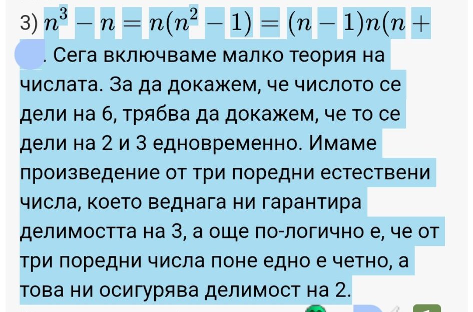 Мерси. До разлагането и делимостта на 2 стигнах и аз. Не мога да си обясня защо в редица от 3 последователни числа едното винаги се дели на 3. Chat gpt говори за връзка с признака за делене на 3, но в тетрадката на детето той е, че сборът на последните 2 цифри трябва да се дели на 3 и не виждам връзката