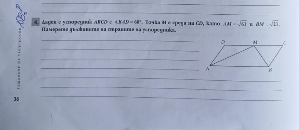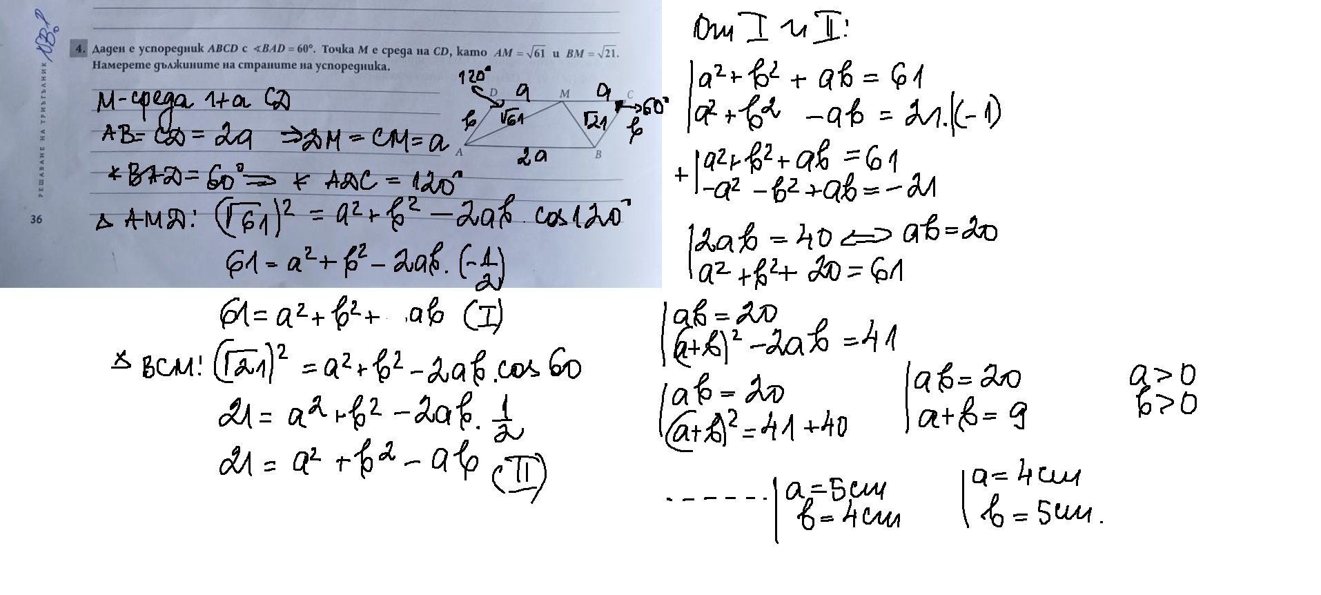 Успоредник, единият ъгъл е 60, другият 120. AB=DC=2a, BC=AD=b. Косинусова теорема за триъгълници AMD и BCM.