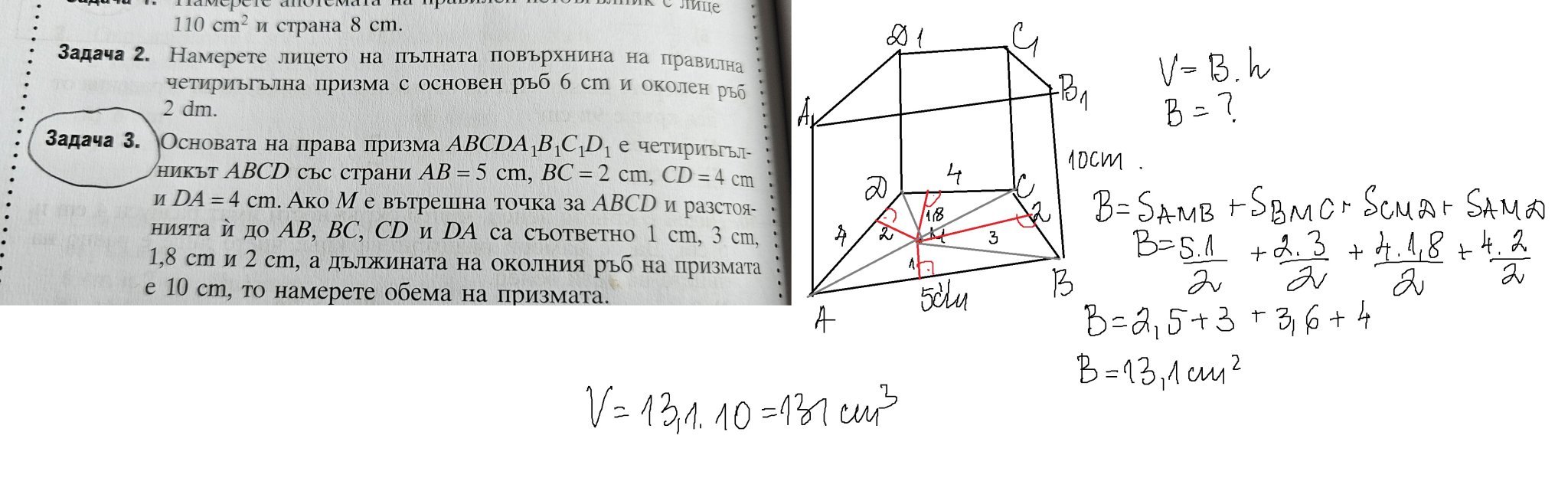 знаете дължините на страните и разстоянието на точка М до всяка страна = височината в съответния триъгълник (ABM, BMC, CMD, DMA),  можете да намерите лицето на четирите триъгълника по формулата S=a.h/2,  SABM=5.1/2=2,5 cm2 и така за останалите триъгълници, събирате лицата и намирате лицето на четириъгълника, който е основата. Умножавате по дължината на околния ръб и намирате обема.