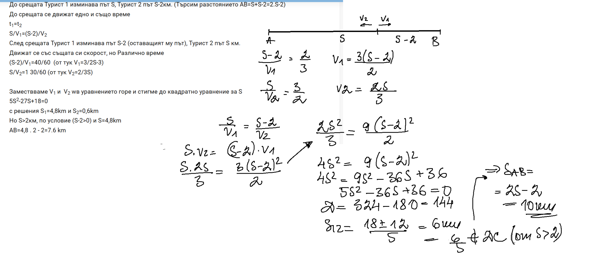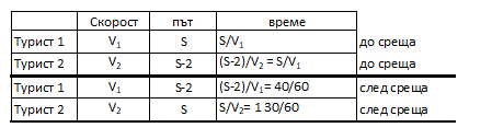 След срещата Турист 1 изминава път S-2 (оставащият му път), Турист 2 път S км.
