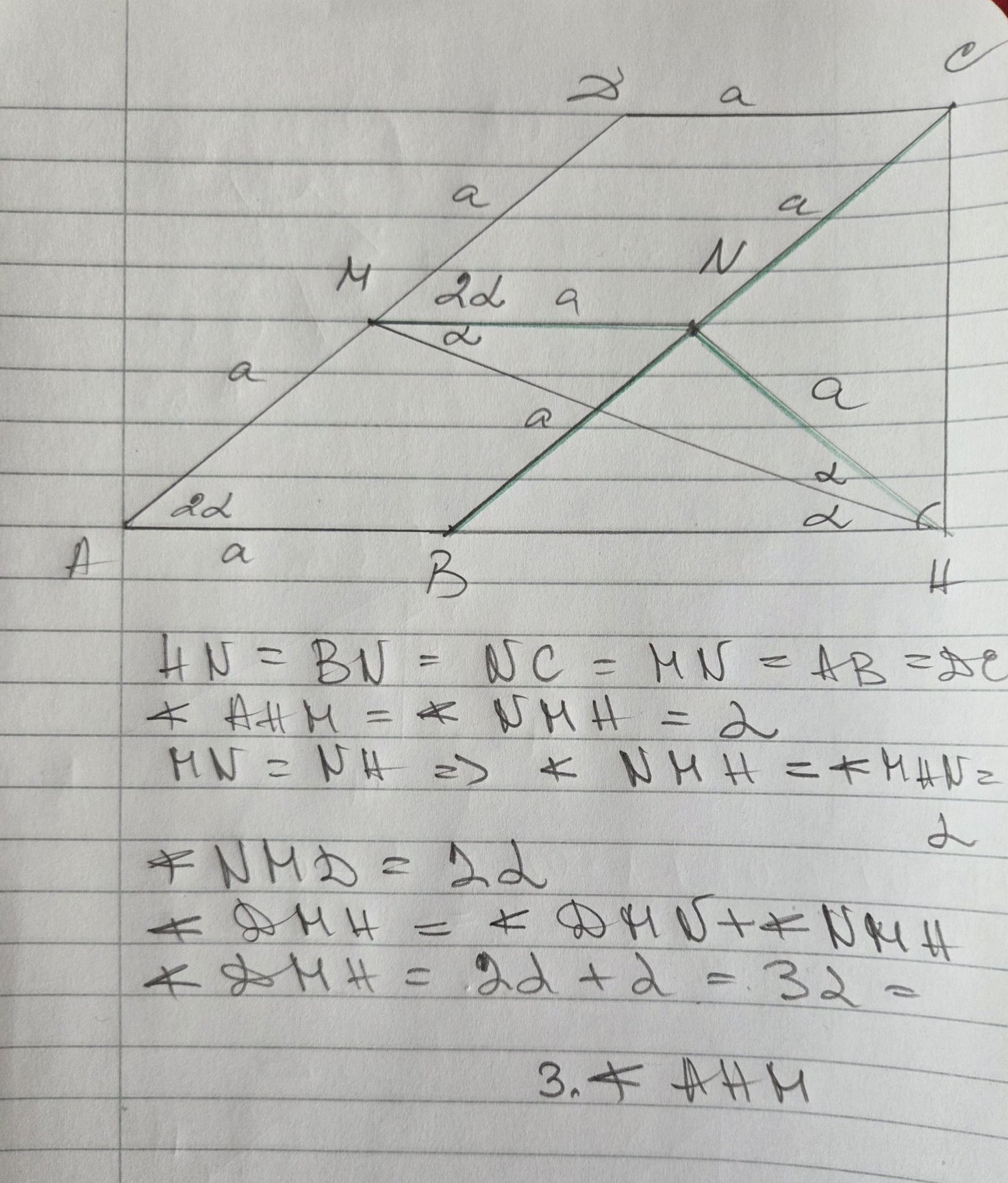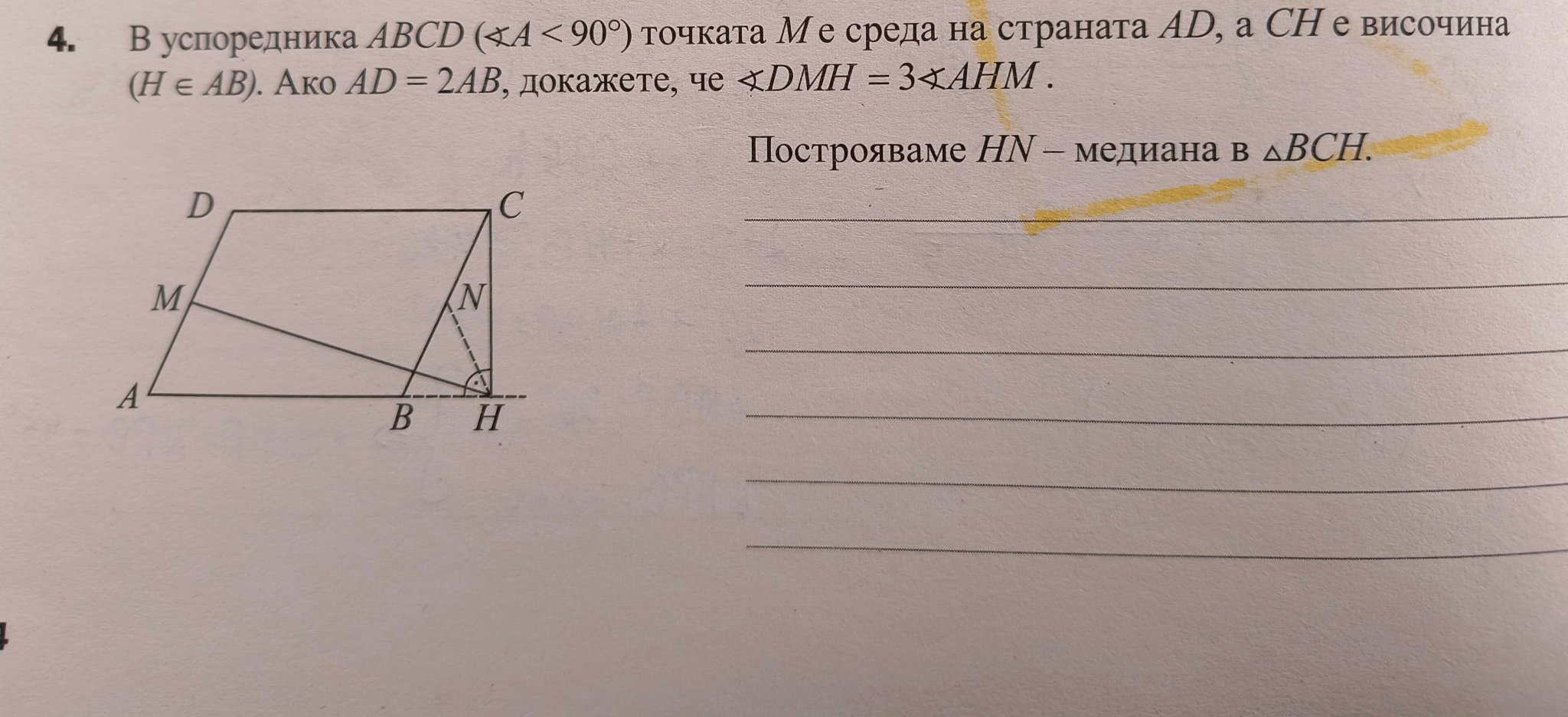 ВС и CD на успоредника ABCD, такива, че вм = DN. Нека Р е пресечната точка на BN и DM. Да се докаже, че точката Р е равноотдалечена от правите АВ и AD.”