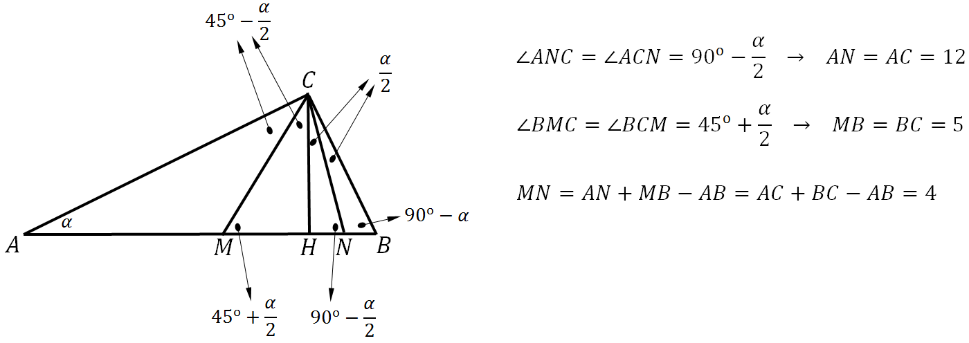 В правоъгълния триъгълник АВС със страни AB=13, BC=5, AC=12 е построена височина СН. Ако СМ и CN са ъглополовящи съответно в триъгълниците АСН и ВСН, да се намерят ъгъл МСN и дължината на отсечката MN.