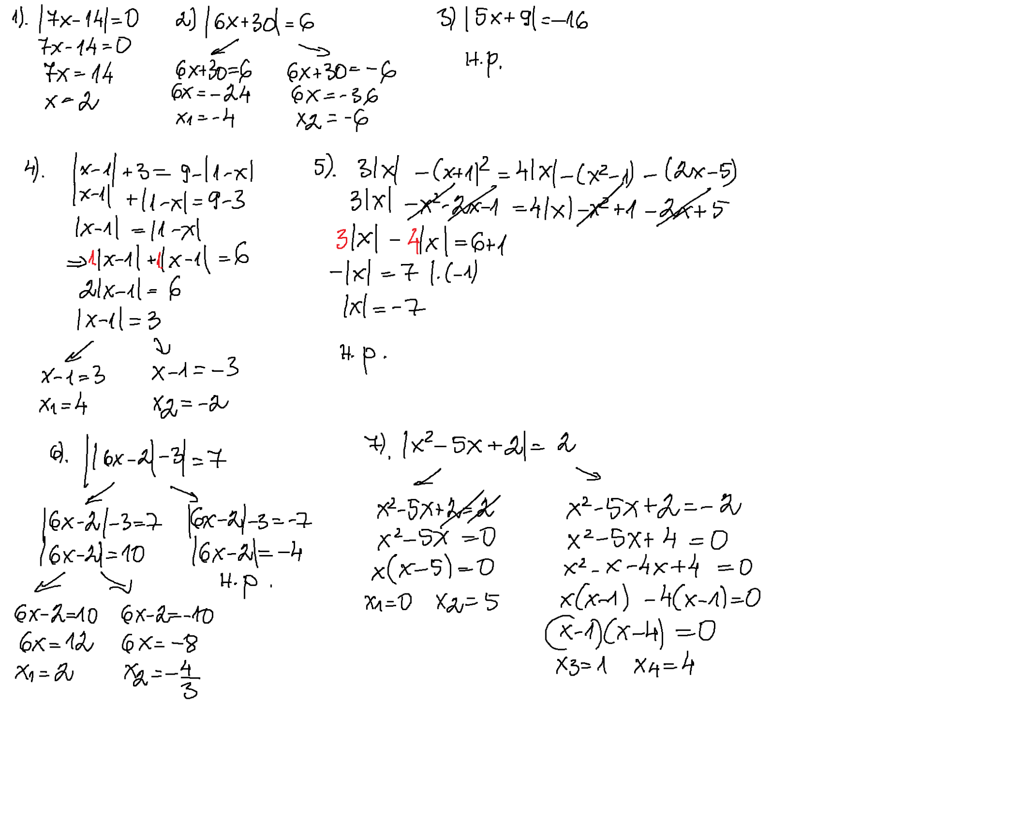 Тета, в 7 клас задачите с модулни уравнения общо взето се въртят около  тези подвидове, като в края всичките се свеждат до едно от първите 3: