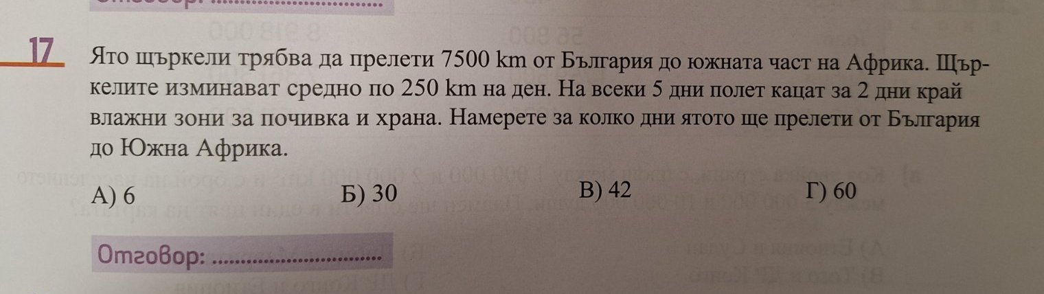 Разсъждаваме по следния начин: след като са необходими 30дни, то след последните 5 дни, те вече ще са пристигнали и 2дни за почивка няма да се добавят, т.е. дните са 30+5*2 = 40 дни.
