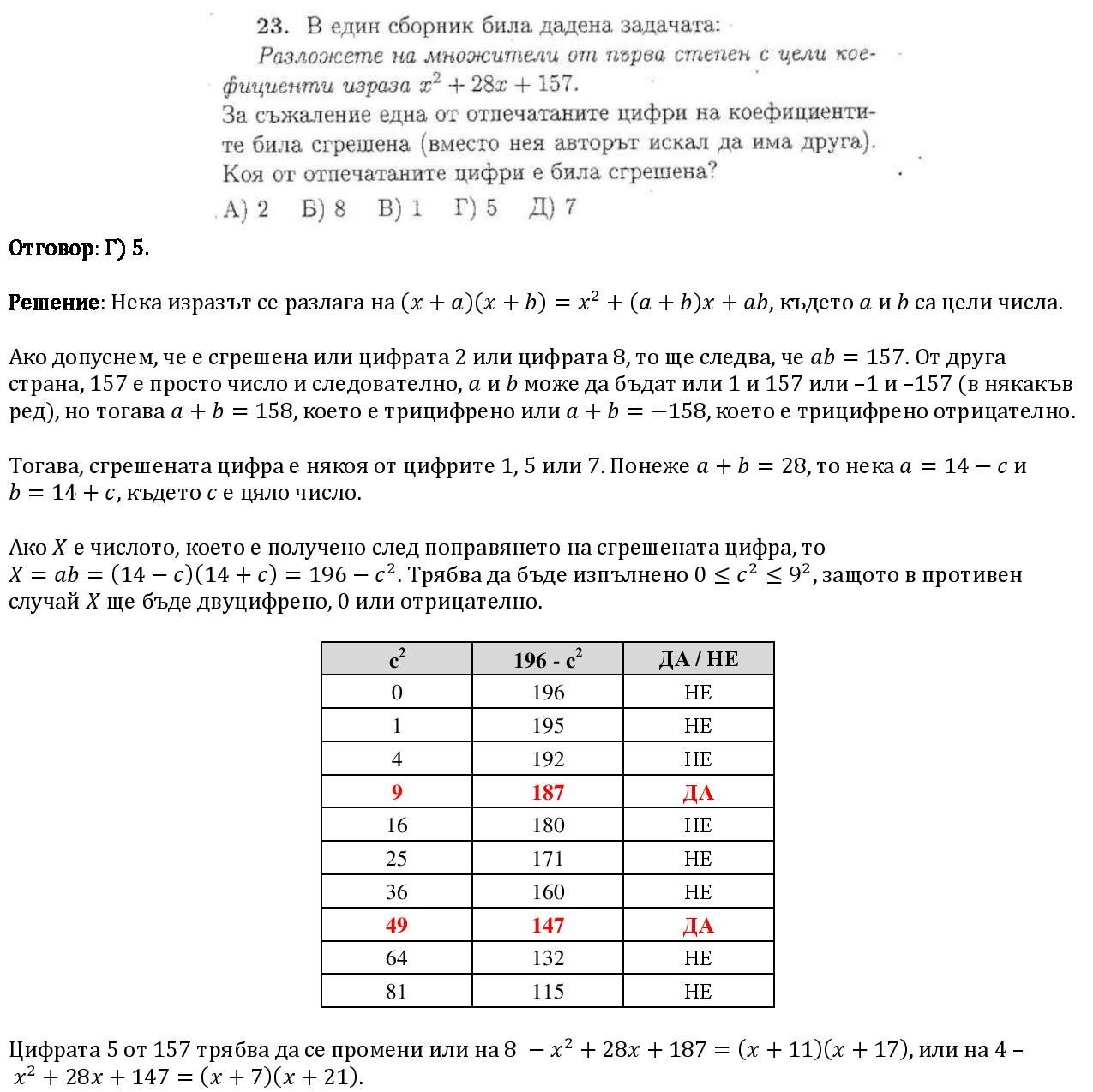 23) Дискриминантата (съкратената) е 196-157=39 и трябва да е точен квадрат с промяна на точно една цифра, така че директно се проверява, че промяна на 2, 8, 1 или 7 не дава такъв резултат, а промяна на 5 по 2 начина дава: