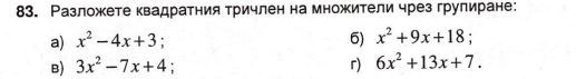 Тя  е  прекрасна  илюстрация за  това, че такива  тричлени с  коефициент  пред кв.  степен,  различен  от  1,  се дават на  7 клас. Хем  коефициентите не  са  големи числа,  хем не е  толкова  видно  като  в  двете  примерчета  на  Веди  по-горе как да се представи  -14х.