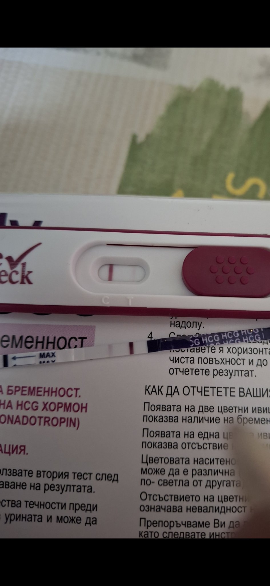 Здравейте,имам интересен казус този месец,цикълът ми идва между 28-30 ден. Имам отрицателен тест на 28ми ден и на 30ти ден.Снощи си направих отново тест, който излезна веднага положителен, сутринта същото положение,веднага две черти. Към 10 часът тази сутрин Sure check писалка ми изглежда отрицателен,малко се изнервих и взех още един Sure check касета този път и го направих към 13:30 има много,много бледа черта ,която си излезна до 10та минута.Мислех,че с първият Sure check просто ще потвърдя положителните, но се обърках още повече.
