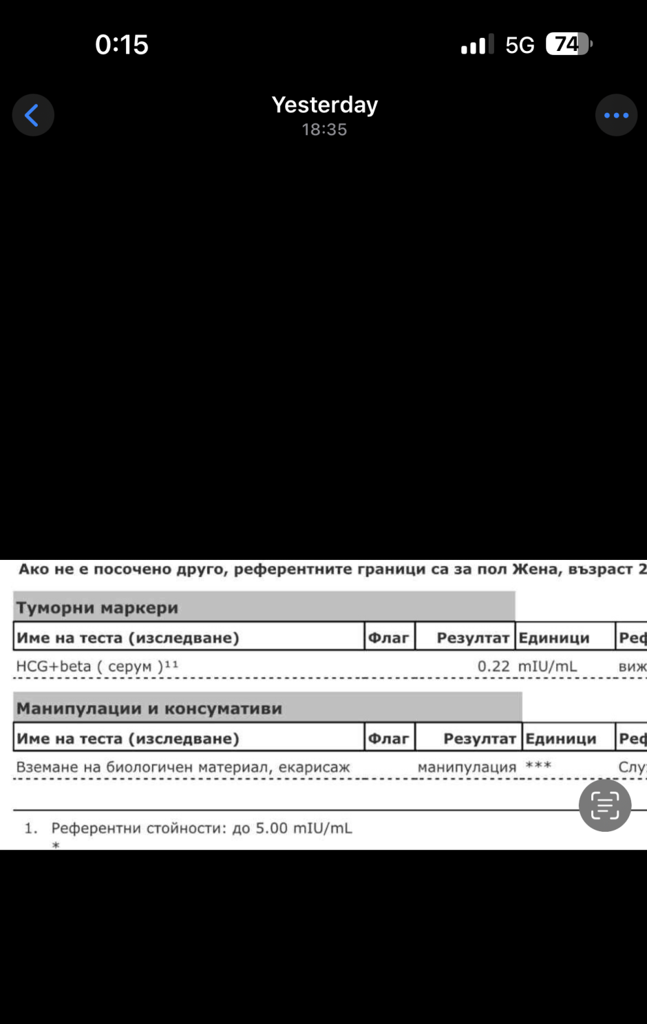 Здравейте! Последна менструация 11 септември, овулация не следена, между 24-27 септември, не се пазим от август, чести контакти и за това не следя овулация, с точен цикъл съм и днес на 8 октомври трябваше да ми дойде, но не ми е все още, сутринта направих surecheck, нямаше нищо. След това направих clear blue ранен, излезе черта бледа,  но може би към 9-10 минута и чак след това се засили, но с цвета на контролната линия. Реших да направя кръвен, 0.22 стойност. Прикачвам снимки
