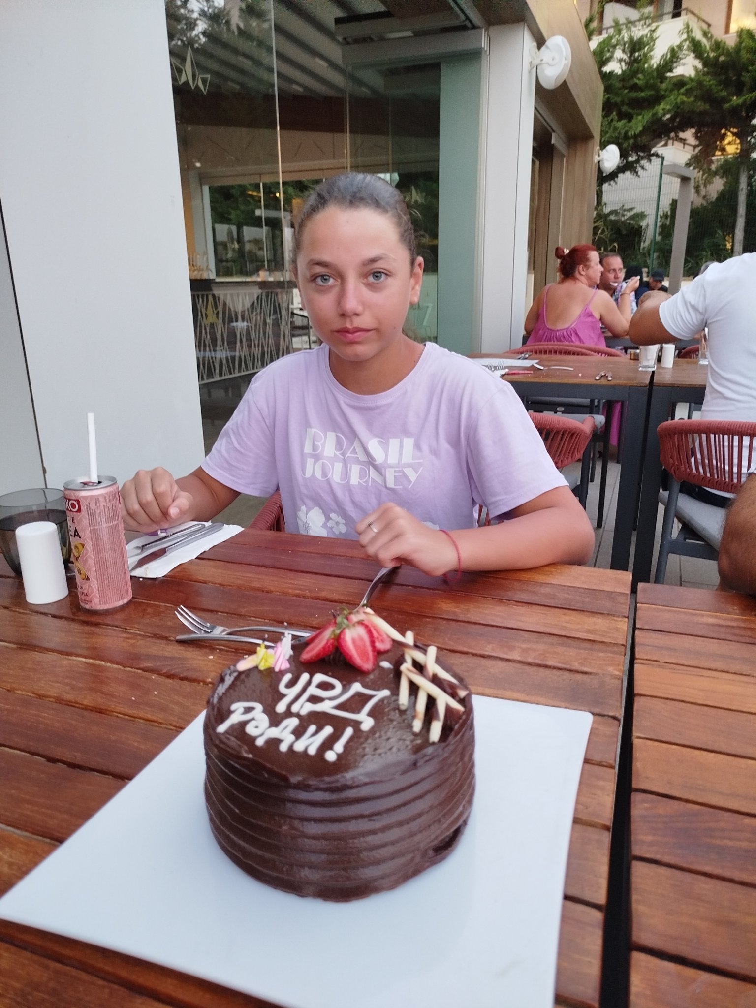 Както бях споменала в преден пост, дъщеря ни беше рожденичката. Имаше комплимент от хотела в деня - купа с плодове и картичка. Като всяко дете явно очакваше торта 😅 Та тайно от нея говорих с рецепция и се разбрахме да я изненадат с торта по нейн вкус а именно шоколадова и дори да и сложат надпис. Вечерта имахме резервация в Средиземноморския ресторант и когато дойде време за десерта всички сервитьори се събраха и и донесоха тортата със запалени свещички и песен до масата. Еми детето чак се разплака 😊😊😊