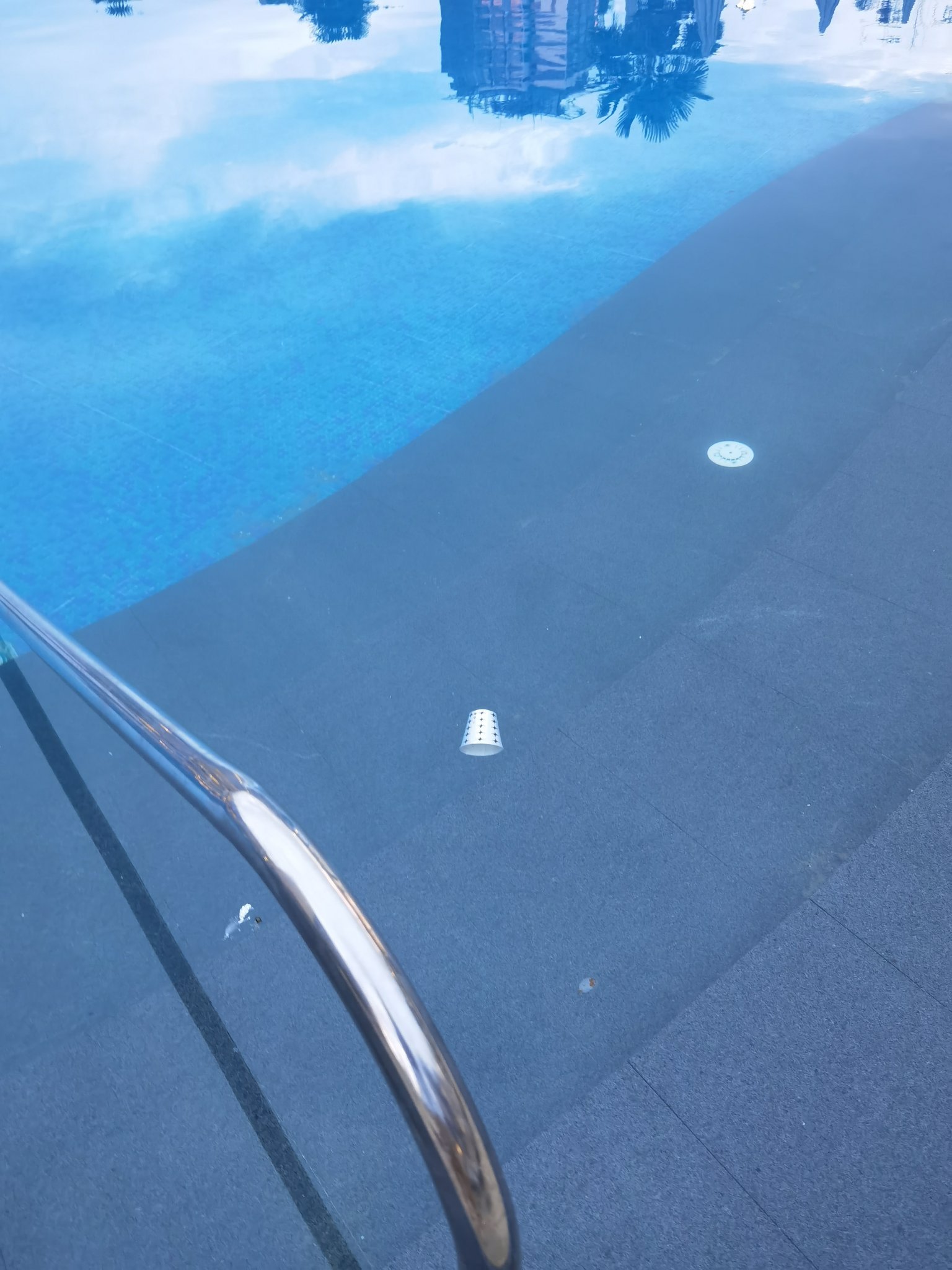 Това е външния басейн, косми, храчки кенчета и чаши. Днес по едно време заваля и решихме да влезем на вътрешния, плуваха кичури коса и беше зеленясъл. Храната е добре иначе, десертите са петифури пасти и баклави, нищо особено.