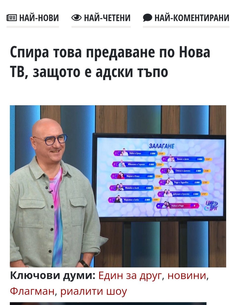 Попадна ми това, дали наистина ще го спират. По един епизод на седмица, защото нямало гледаемост.