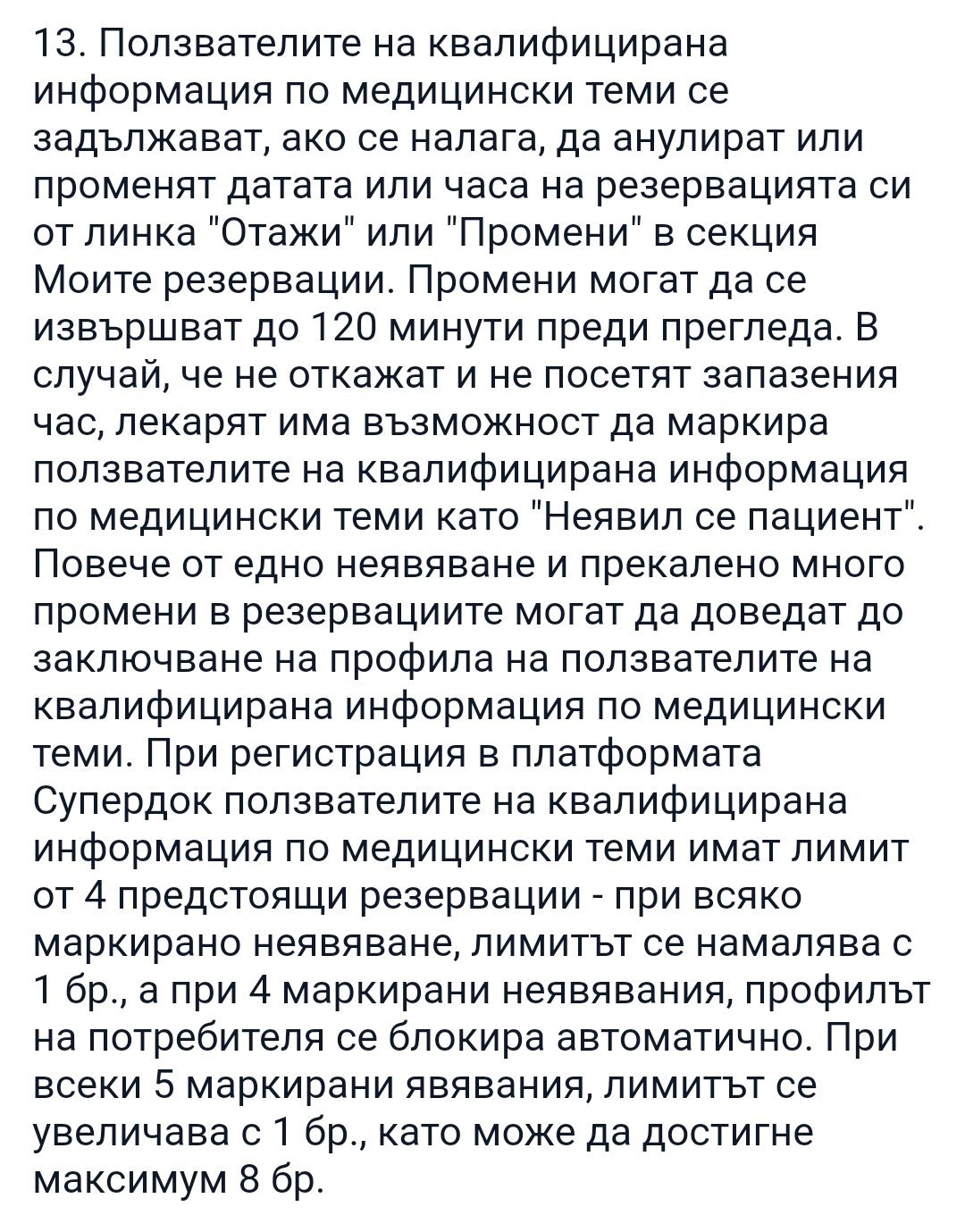 Аз имах случай, при койта се явих на преглед, но поради странични причини се разбрахме с лекарката да го преместим. Предложи ми да взема направление, за да ме препрати за друг преглед по здравна каса при друг специалист, който не работел с фондовете. Взема обаче, че ме отбелязала като неявила се. Аз, разбира се, веднага сигнализирах Супердок и поисках да напрявят корекция, но те казаха, че не можело.