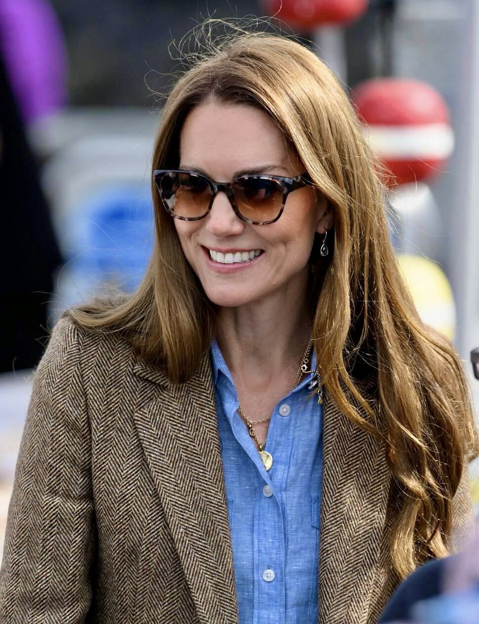 Принцесата, която се съчета със съпруга си с карирано сако и синя риза, допълни образа с две колиета от една от любимите си бижутерки, Даниела Дрейпър.Златното колие с фиксирана азбука на стойност 495 паунда е с висулки G, C и L за принц Джордж, принцеса Шарлот и принц Луи.