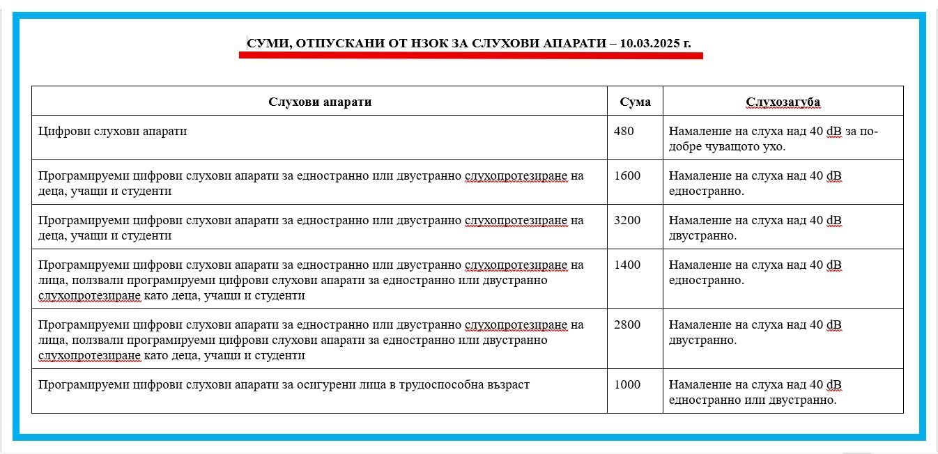 Може да кандидаства за апарат по НЗОК. По НЗОК за покупка на слухови апарати се отпуска при слухова загуба над 40 dB, ако сте възрастен и над 30 dB при деца. За пенсионери се отпуска само при двустранно намаление на слуха. След посещение на лекарска комисия за извършване на изследване, което да установи слуховата загуба може да кандидаства (480 лв.).