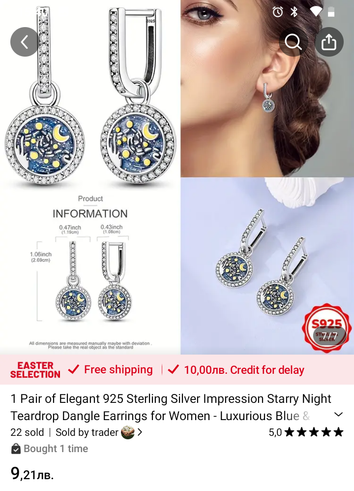 Споделям положителните си впечатления от бижута. Имам повече от 1 дупка на ухо и правя различни комбинации. Пише, че са сребърни. Не съм проверявала, но са красиви и качествени: