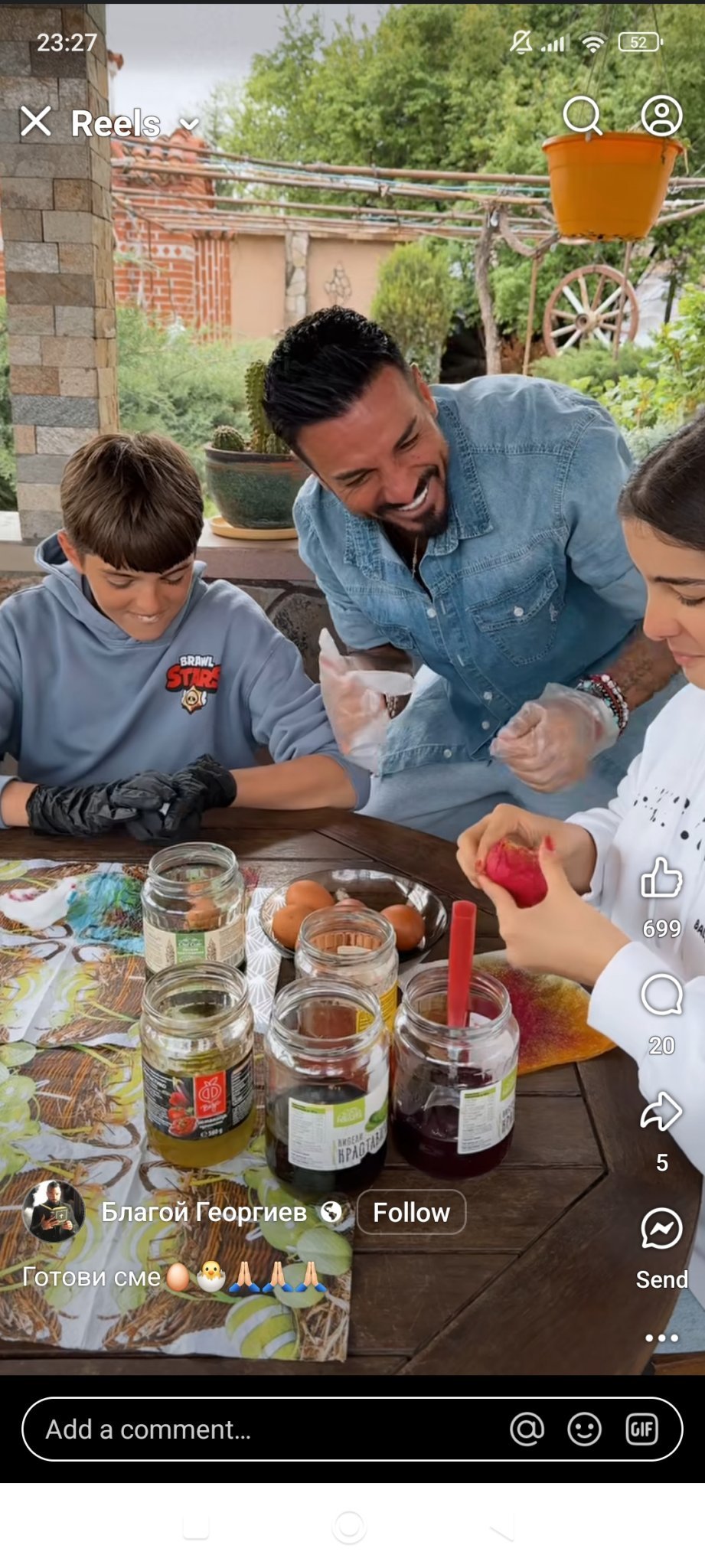 Снимка на Благо, боядисващ яйца с децата си (и с трите, но моят скрийншот хвана само две):