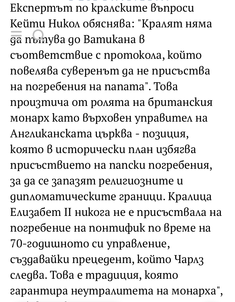 Понеже днес погребаха Папата и доста се изписа кой присъства, защо и как, да споделя как още преди дни ми попадна коментар относно отсъствието на кралските (британски) особи в длъжност на погребение на Папата.