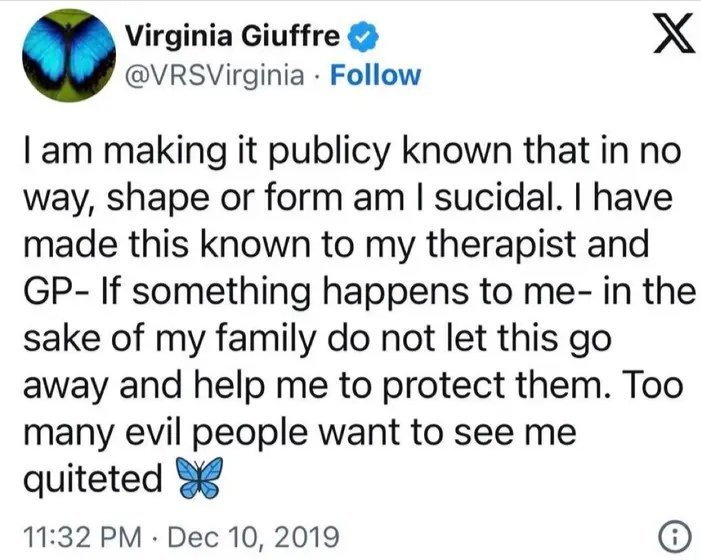 Вирджиния Гофре (жената от скандала с принц Андрю) се е самоубила.