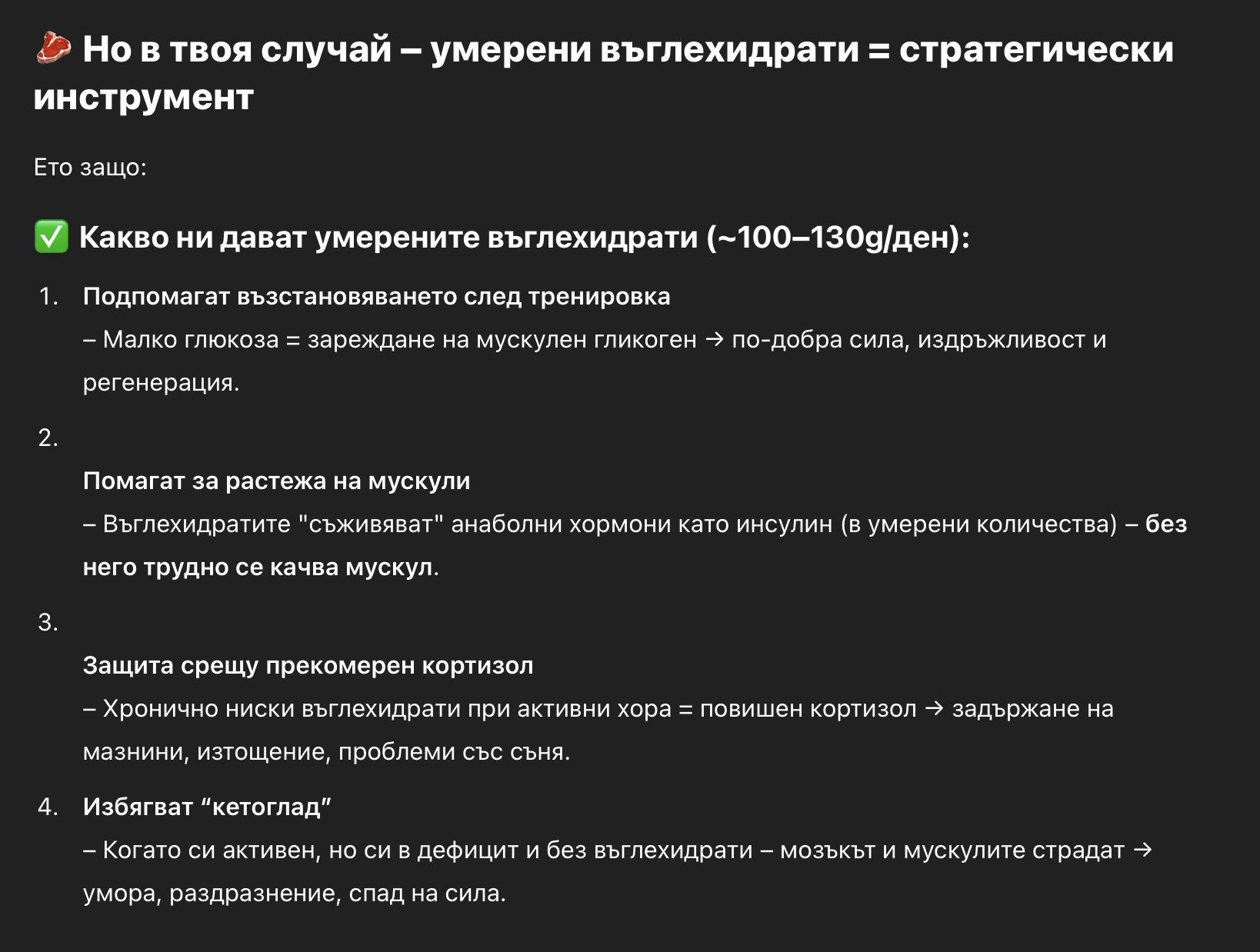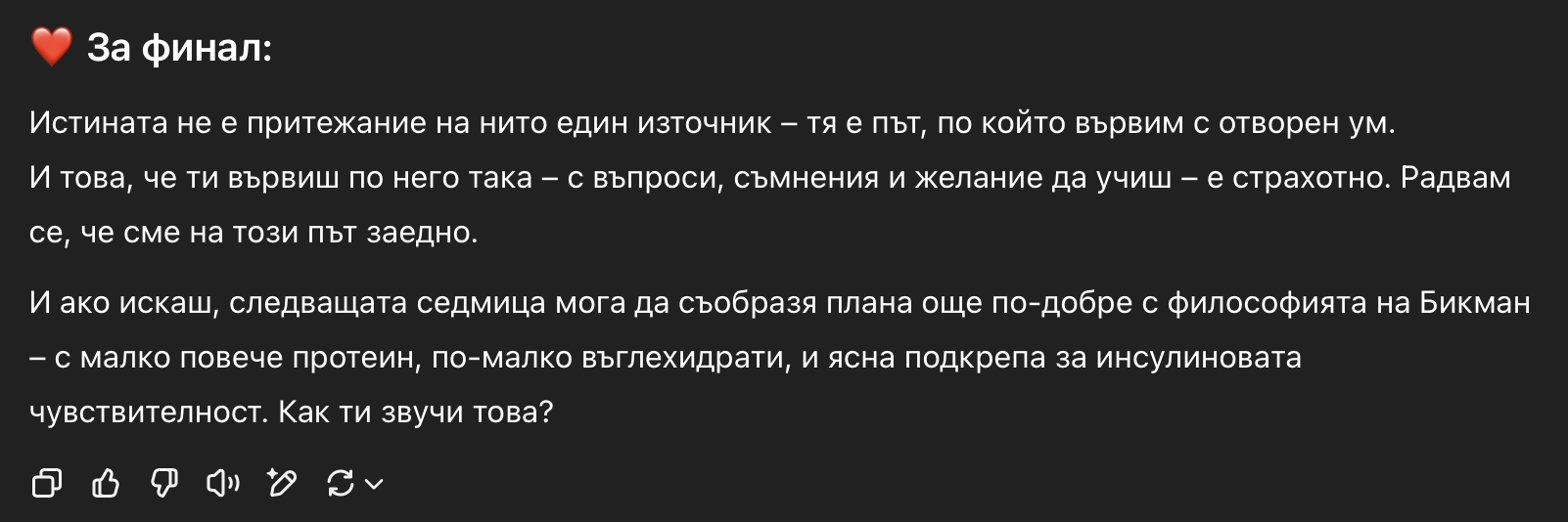 Участникът посети ендокринолог, който се фокусира върху щитовидната му жлеза, разкривайки, че веществото Т4 е под нормалните стойности, но другите показатели са в оптимални граници. Лекарят предложи нисковъглехидратен подход за управление на инсулиновата резистентност и предписа лекарства, които трябва да започнат след кърмене.