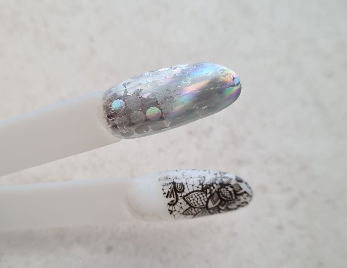 Печа го също 60 секунди, не е като да не лепи, но е някак слабичко. Фолиото не се лепи равномерно, ако изобщо се залепи. И като е на шарка след това не иска да се дозалепи на определените места. Супер странно е. Прикачвам снимки на някай мостри за пример. На мойте нокти става дори по-зле от мострите хахах.