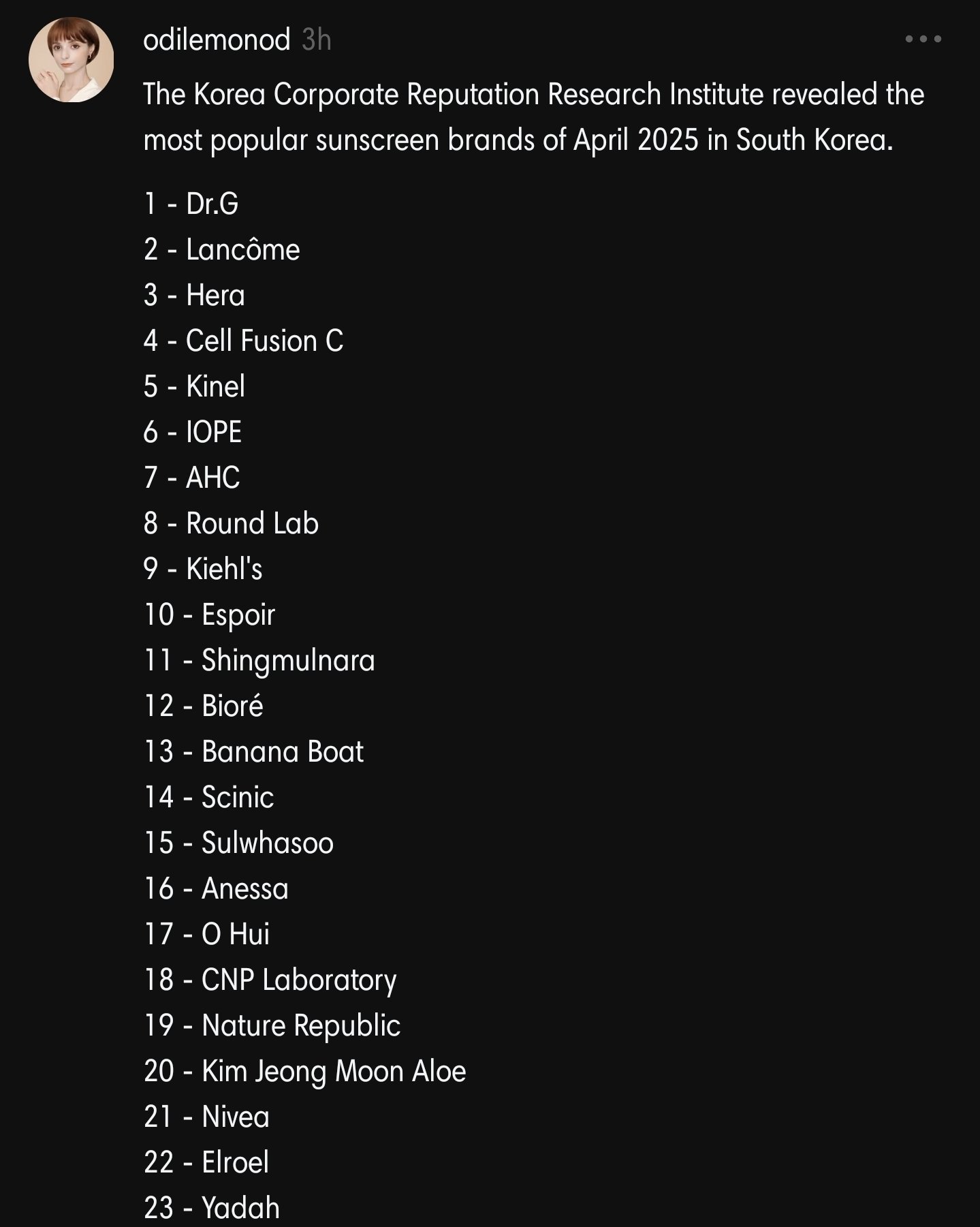 Най-популярните марки за слънцезащита в Корея за април 2025 според Korea Corporate Reputation Research Institute: