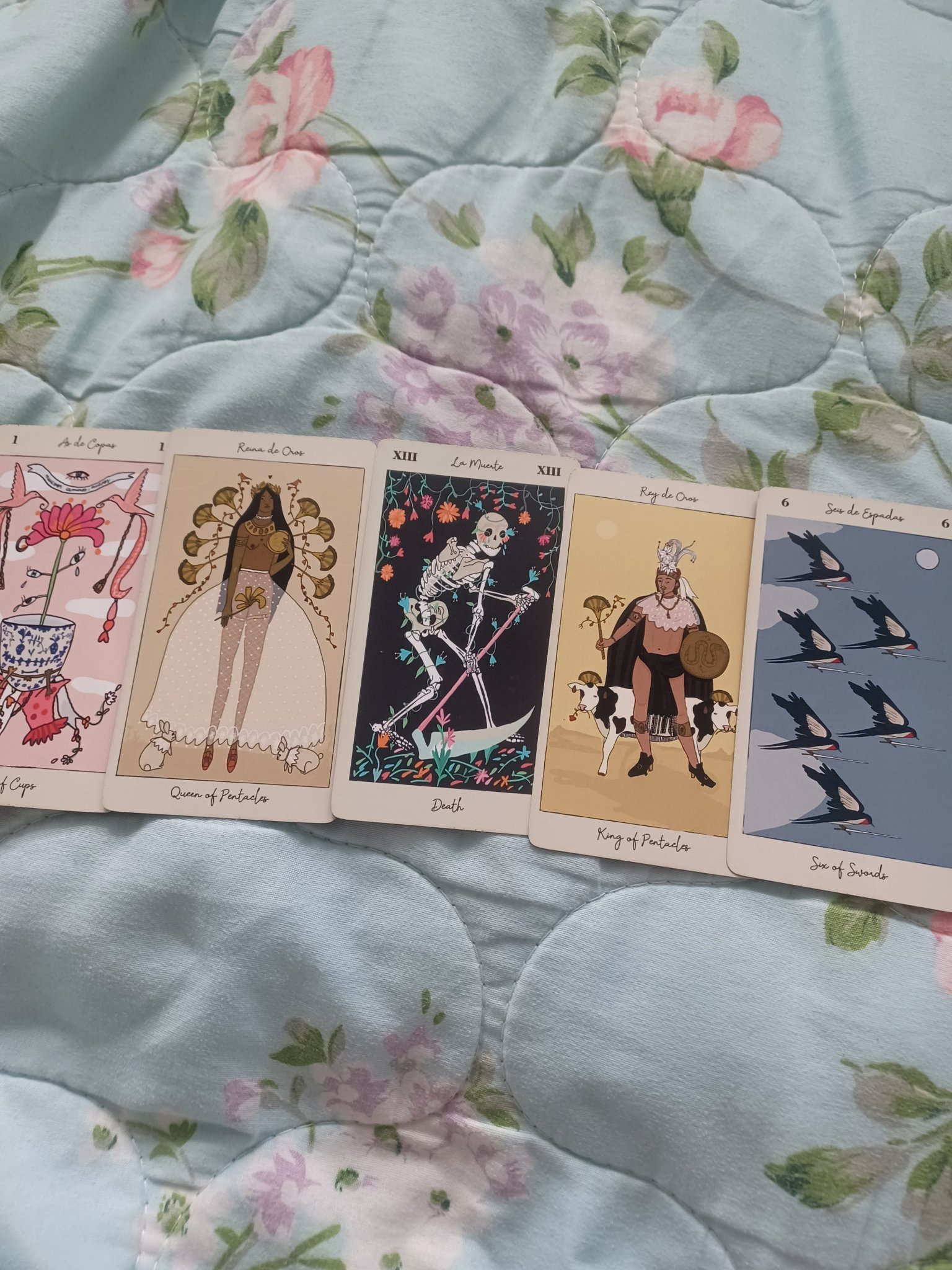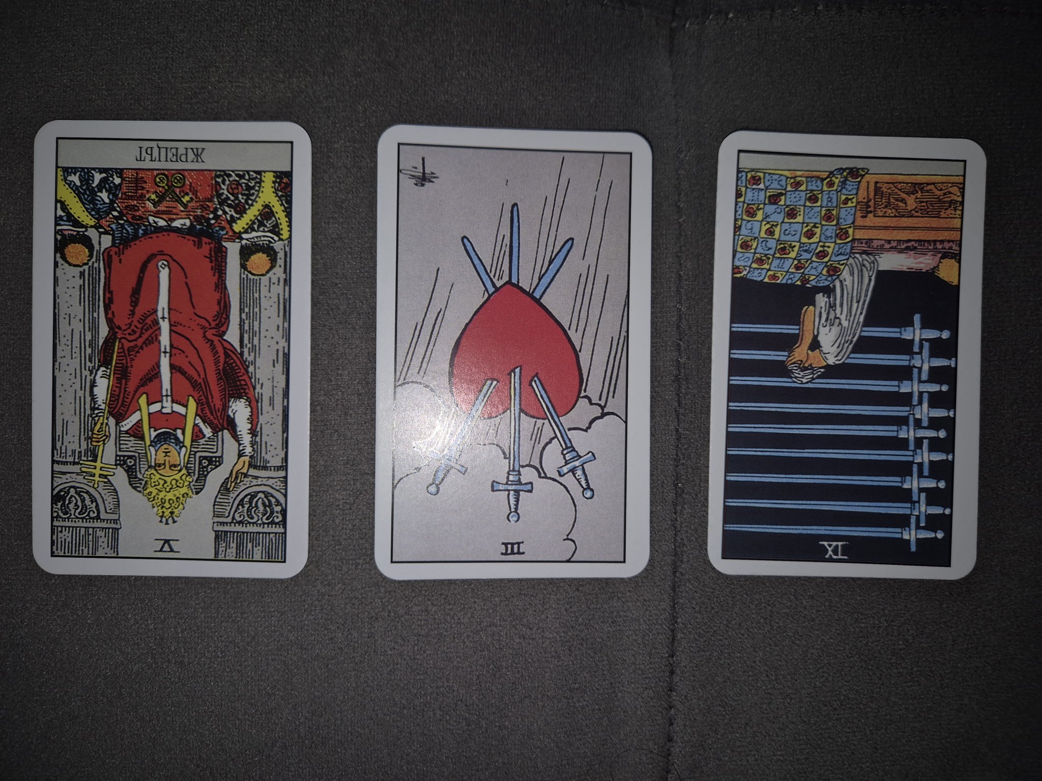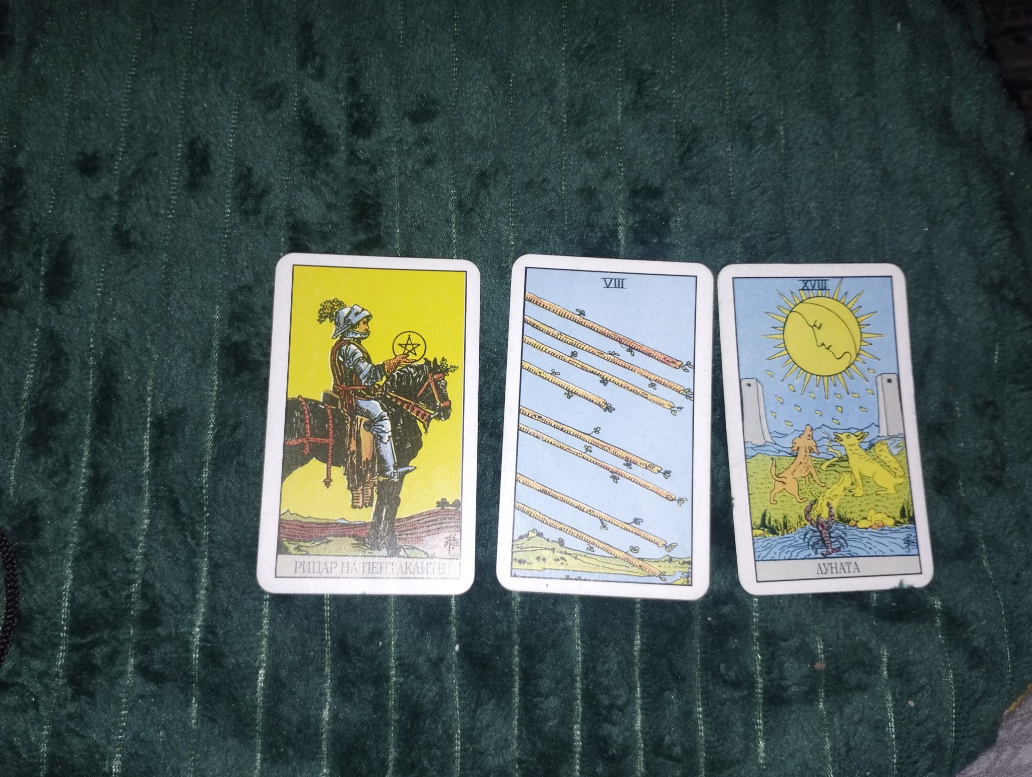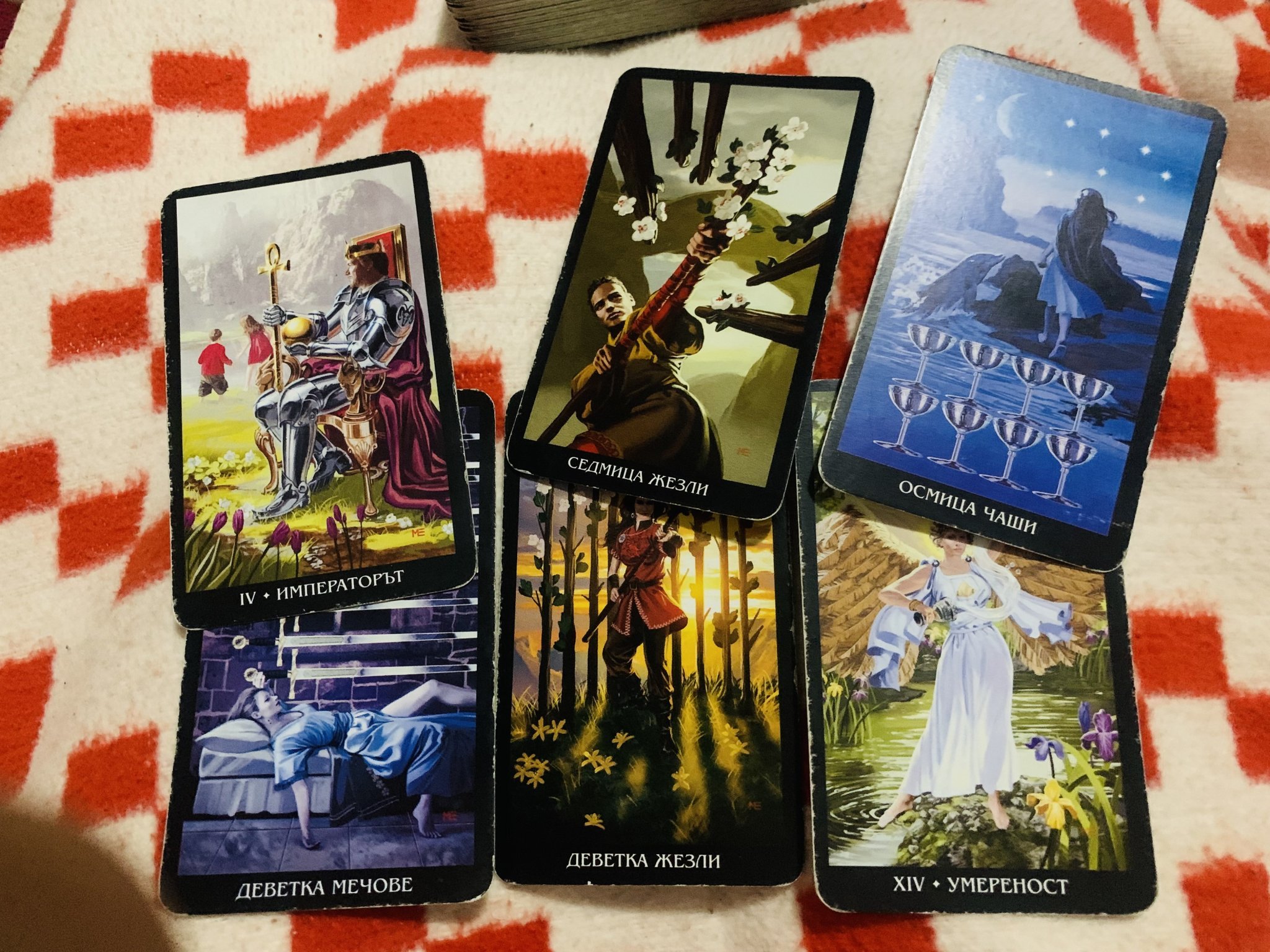 Основните карти са 9 мечове, 9 жезли, умереност, пак съм ги подчертала с допълнителни карти.