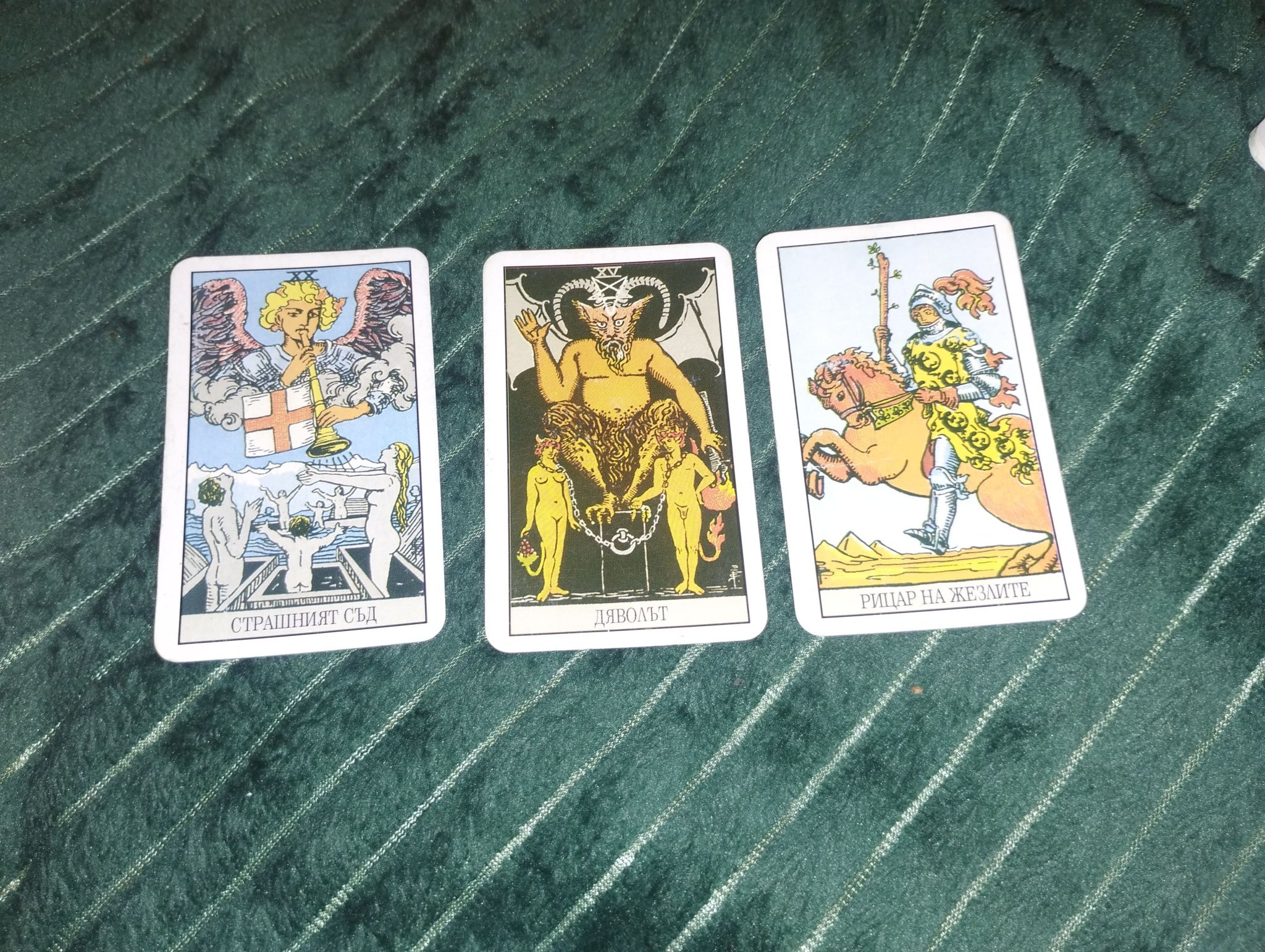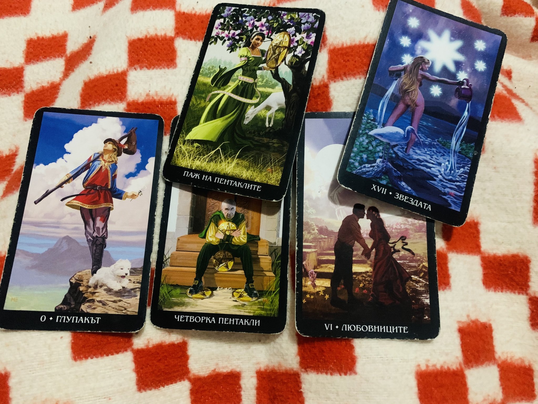 Глупакът, 4 пентакли, любовниците. Изтеглих и 2 подчертаващи карти за 4 пентакли и любовниците.