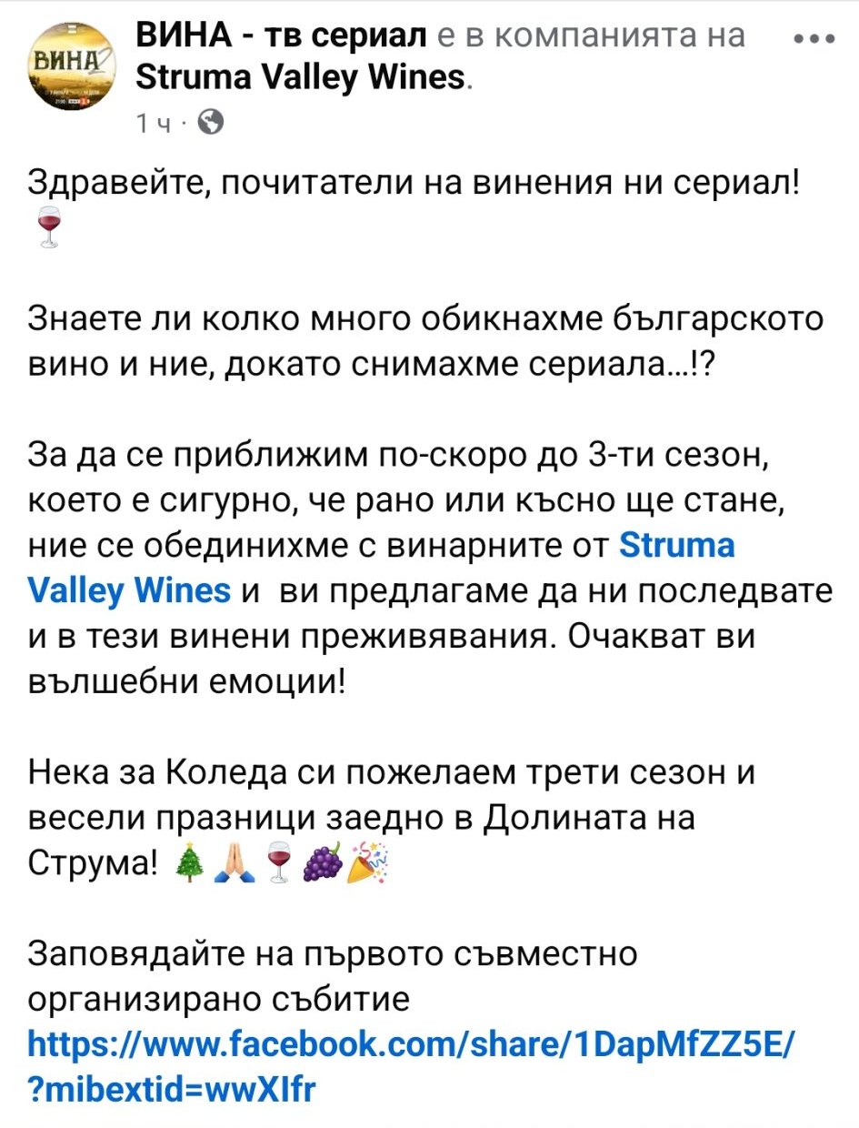 С риск да ме намразят тези които не искат продължение на Вина май наистина ще има трети сезон . Тъкмо да се поправят за втори сезон който ми остави леко горчив вкус.   Все си мисля обаче че Марта лъже от кой е бебето и може да се укаже че не Филип е бащата , но това са само догадки . Все се надявам за щастлив край при Филип и Елина .